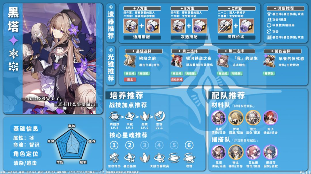 4星角色「黑塔(智识•冰)」冰系群体输出手,就业空间较窄(指材料本)