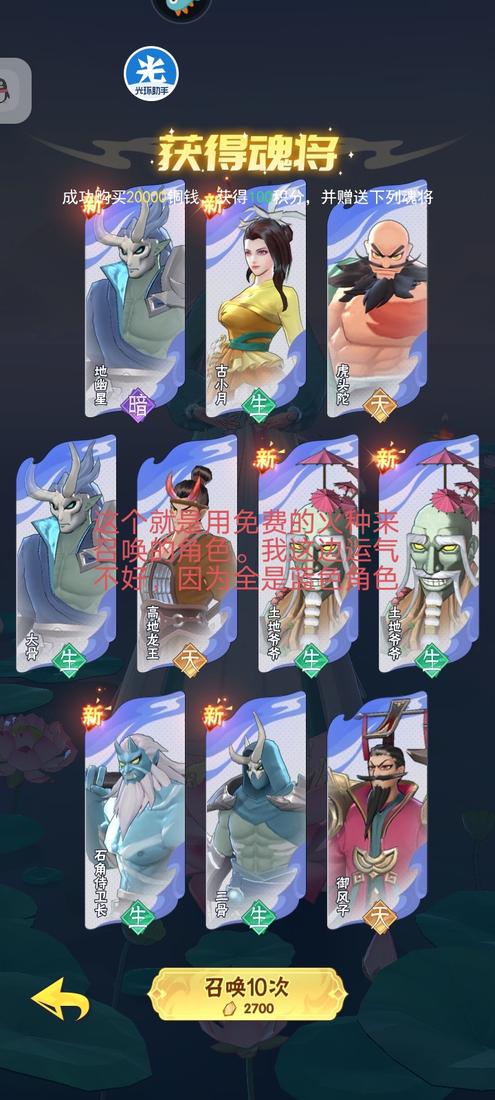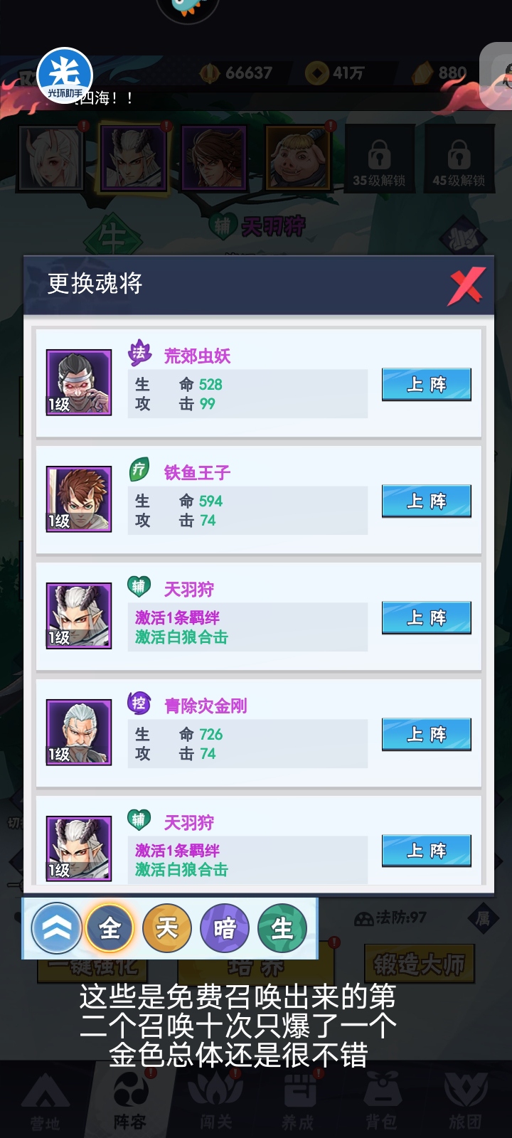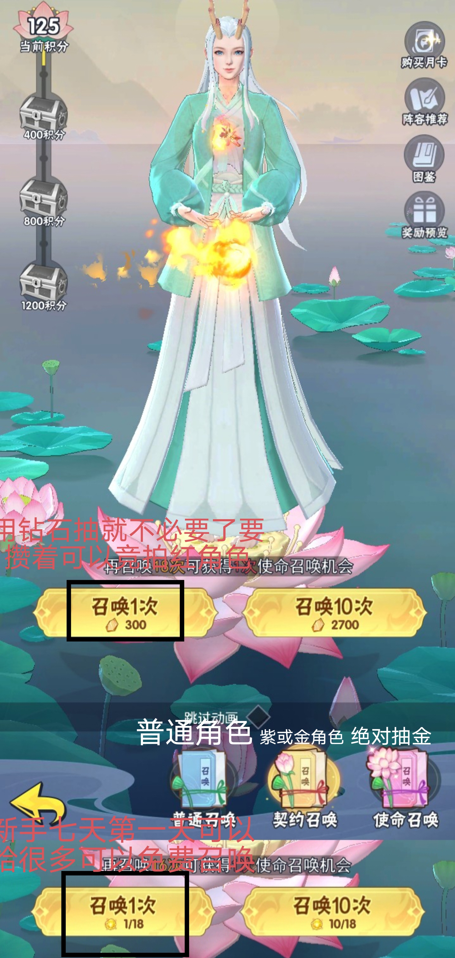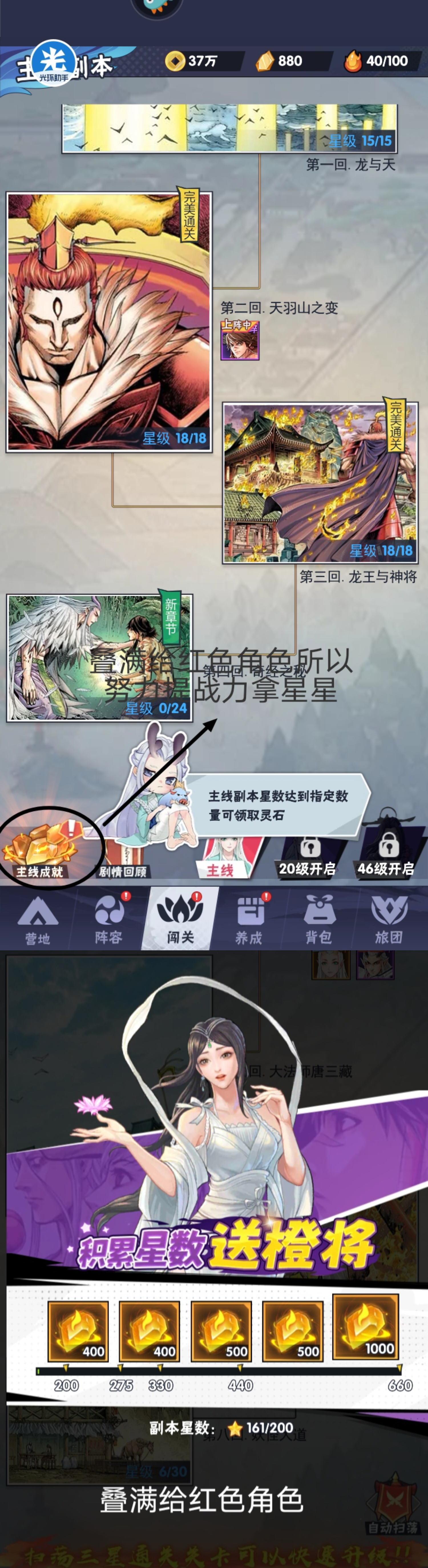 龙神万相:神战(新手攻略〈1〉)OL白山茶发布于 2023-10-18关注开局选择角色一共有两个一个是近战 另一个是远程这个就看个人意愿想选哪个(注意这个选择的角色是不可以换其他角色的所以要斟酌) 开局新手引导可以获得紫色角色是可以用来过度的到20多级的时候火种多了就可以转推金色角色 副本可以扫荡获取装备更好的打副本 可以加速和跳过比较人性化 通关会给装备和进阶角色还有升级的物品 副本推的多了可以免费获取角色如图所示 这个也就是相当于是本命来提高角色的生命攻击有必要凑的提高主力角色的实力 本命加成也是很高的金色角色比普通的高红色也一样 这些是我抽的运气不是很好 旅团是要进的可以获取重要的资源来提高战力 这个就是第一天可以获取比较多火种的地方主要还是推本以及扫荡 三种召唤简介如图 我召唤出来的角色 兑换角色的商店 钻石兑换 竞拍也是靠钻石 装备商店比较坑的就是蓝色装备要碎片合成 旅团介绍