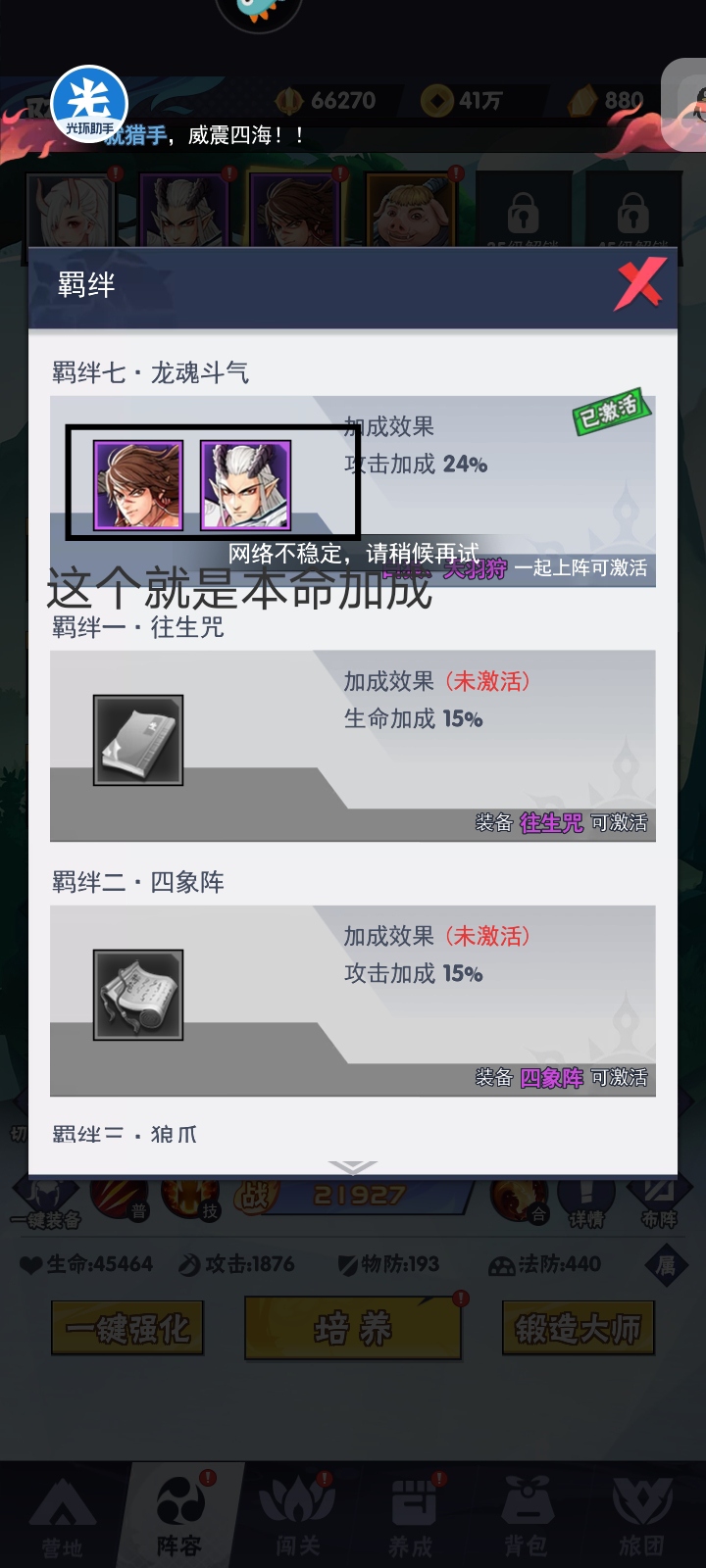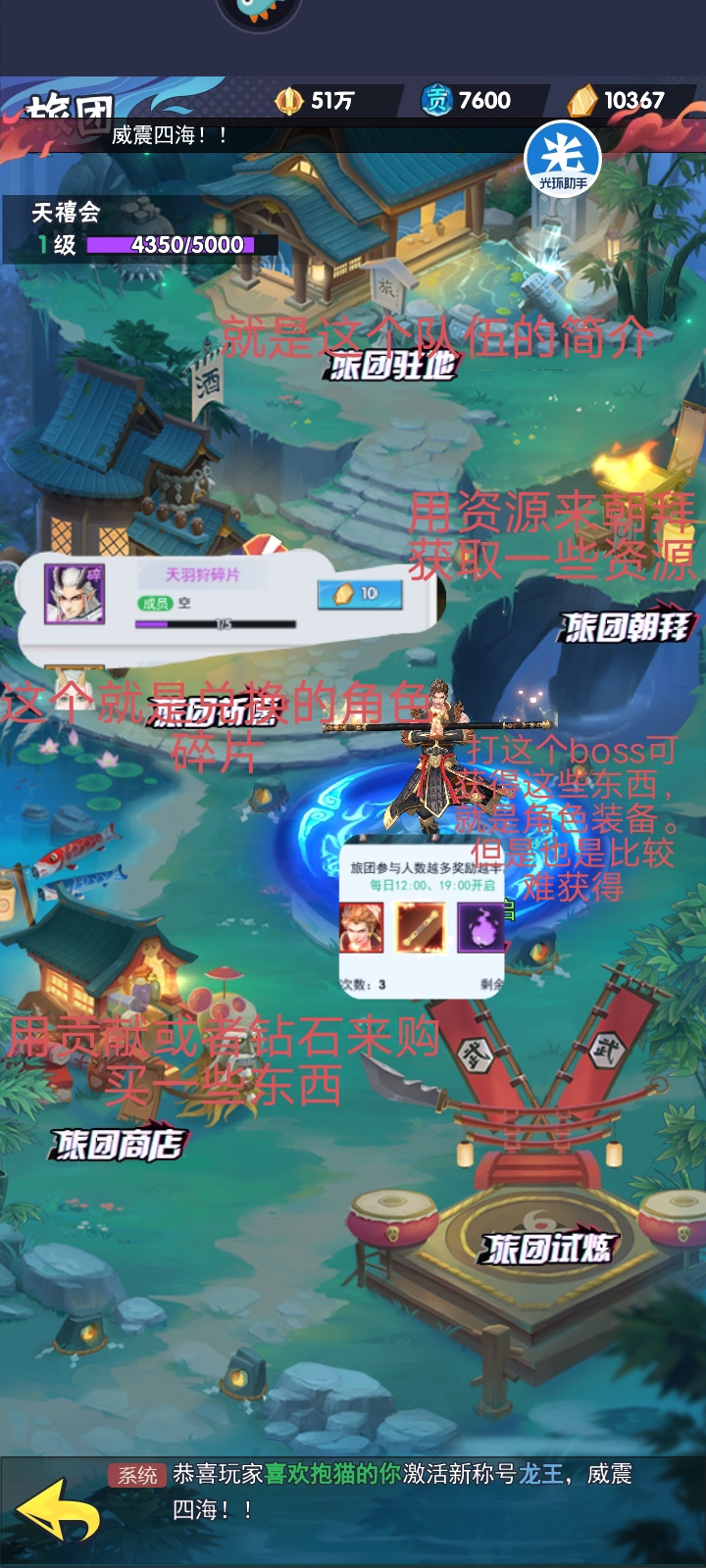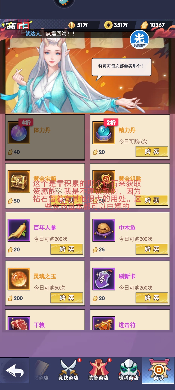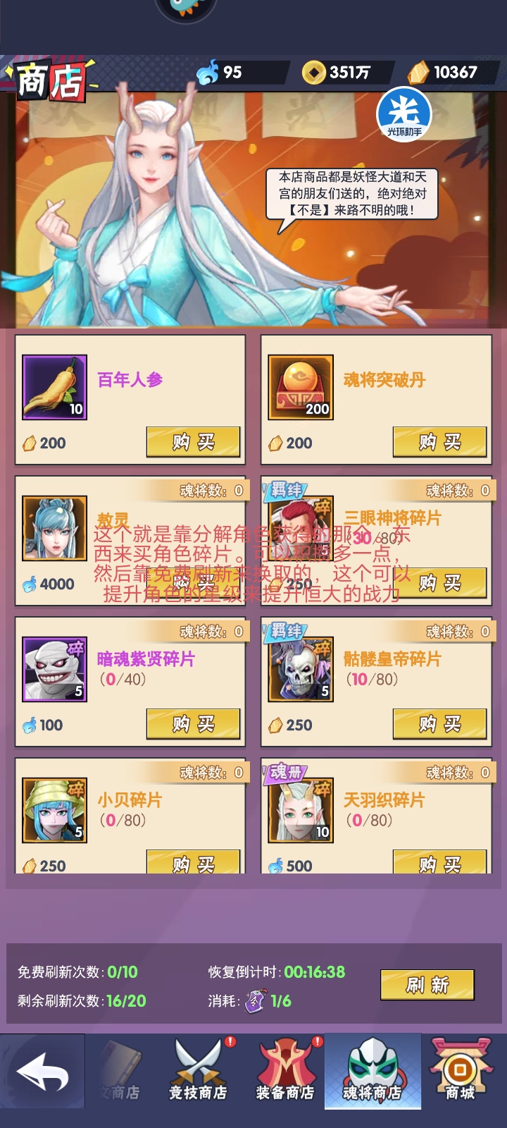 龙神万相:神战(新手攻略〈1〉)OL白山茶发布于 2023-10-18关注开局选择角色一共有两个一个是近战 另一个是远程这个就看个人意愿想选哪个(注意这个选择的角色是不可以换其他角色的所以要斟酌) 开局新手引导可以获得紫色角色是可以用来过度的到20多级的时候火种多了就可以转推金色角色 副本可以扫荡获取装备更好的打副本 可以加速和跳过比较人性化 通关会给装备和进阶角色还有升级的物品 副本推的多了可以免费获取角色如图所示 这个也就是相当于是本命来提高角色的生命攻击有必要凑的提高主力角色的实力 本命加成也是很高的金色角色比普通的高红色也一样 这些是我抽的运气不是很好 旅团是要进的可以获取重要的资源来提高战力 这个就是第一天可以获取比较多火种的地方主要还是推本以及扫荡 三种召唤简介如图 我召唤出来的角色 兑换角色的商店 钻石兑换 竞拍也是靠钻石 装备商店比较坑的就是蓝色装备要碎片合成 旅团介绍