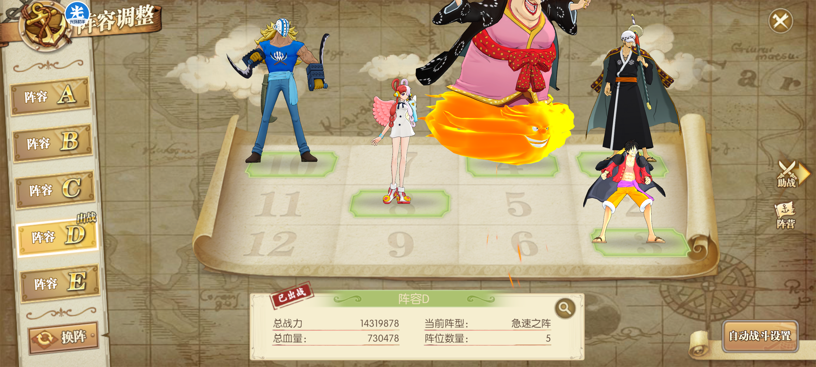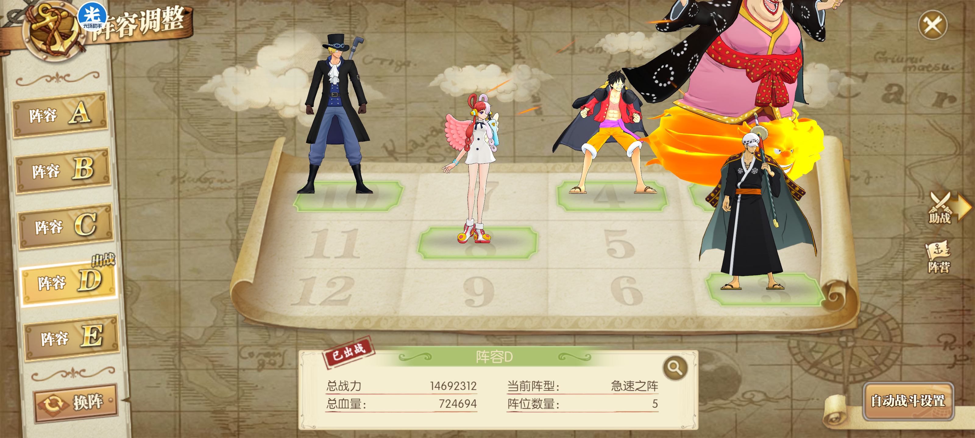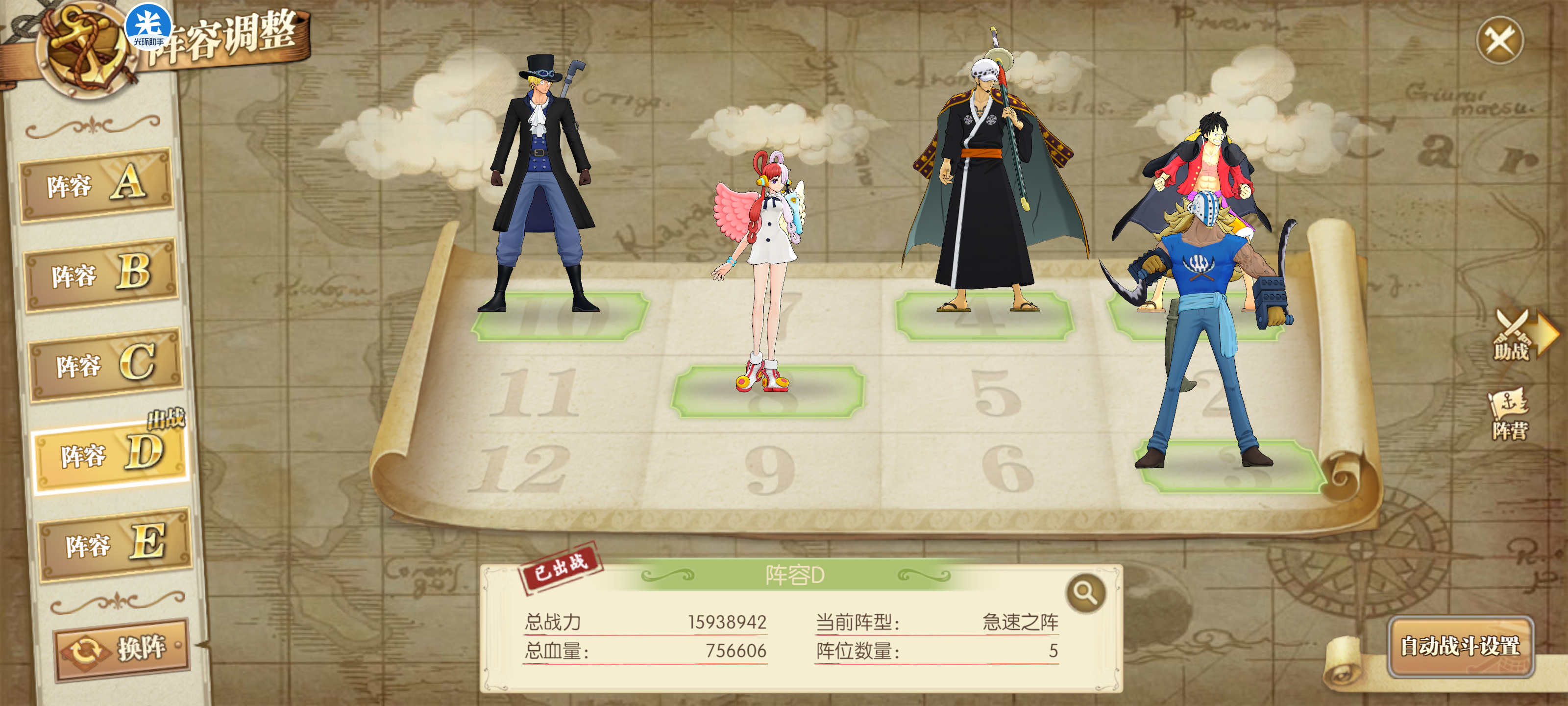 第1个是给没有7星以上UR大妈的玩家,两个超新星可以保证路飞的命中和速度,萨博可以给路飞提供生存能力,对平民来说是一个不错的阵容了。