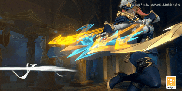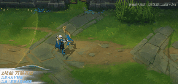 蓄力一击,艾希对前方发射出扇形的多个蓝金色箭矢,对命中的敌人造成伤害。