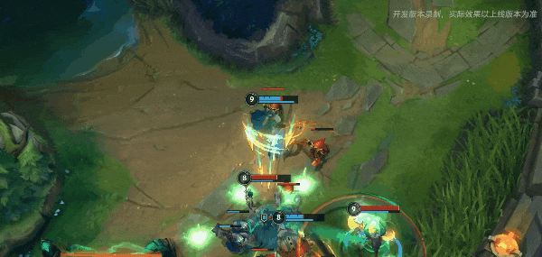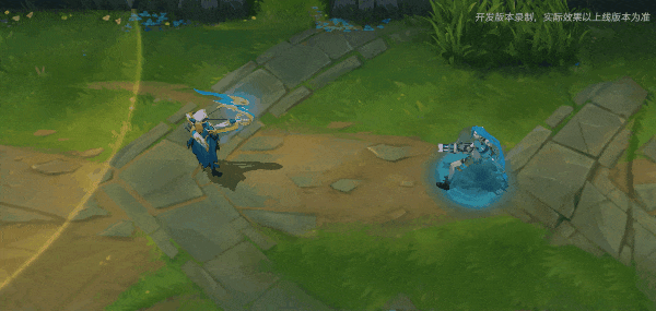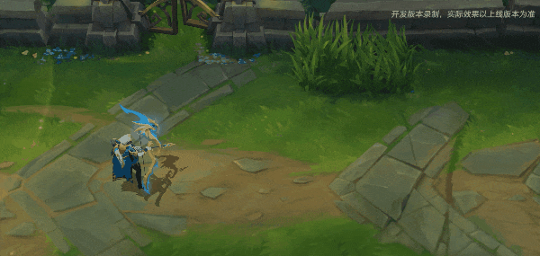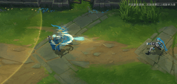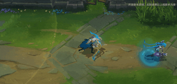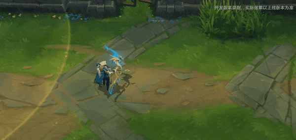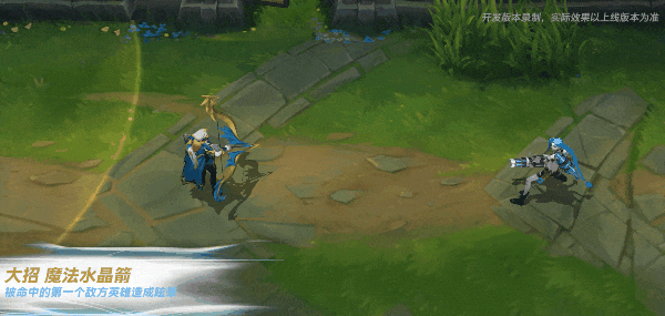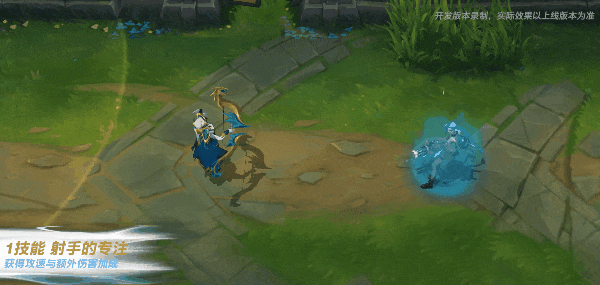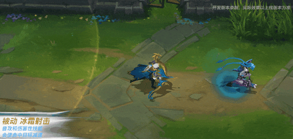 艾希拿起弓箭进行普攻射击时,普攻和伤害性技能会使命中目标减速,敌人脚下出现蓝色光圈。
