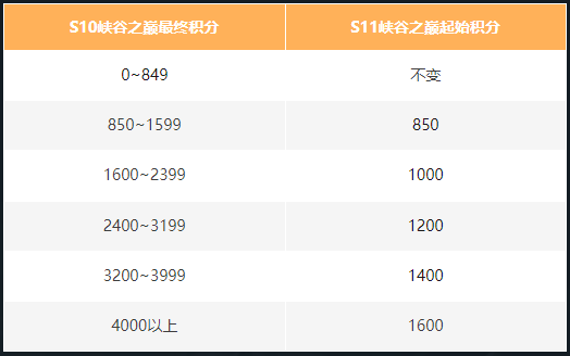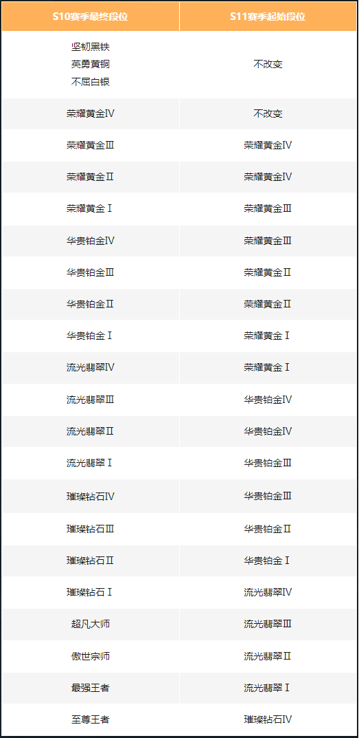 S11新赛季的起始段位将取决于S10赛季结束时的最终段位,详情如下: