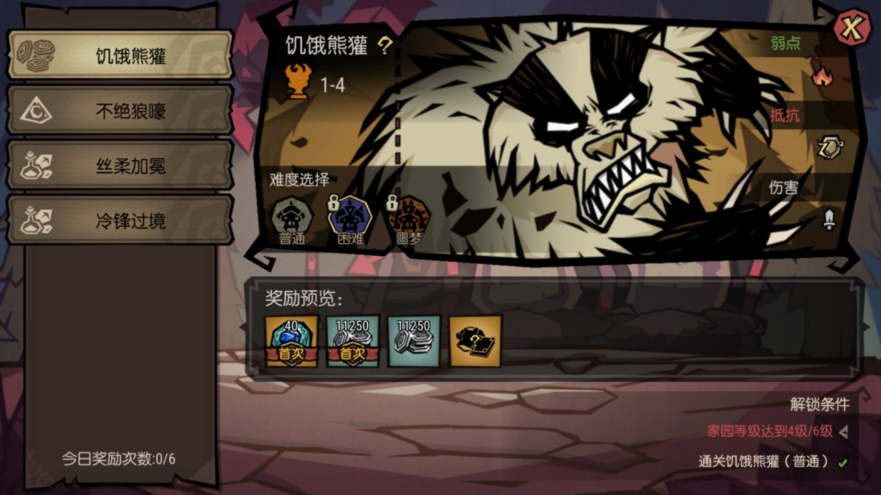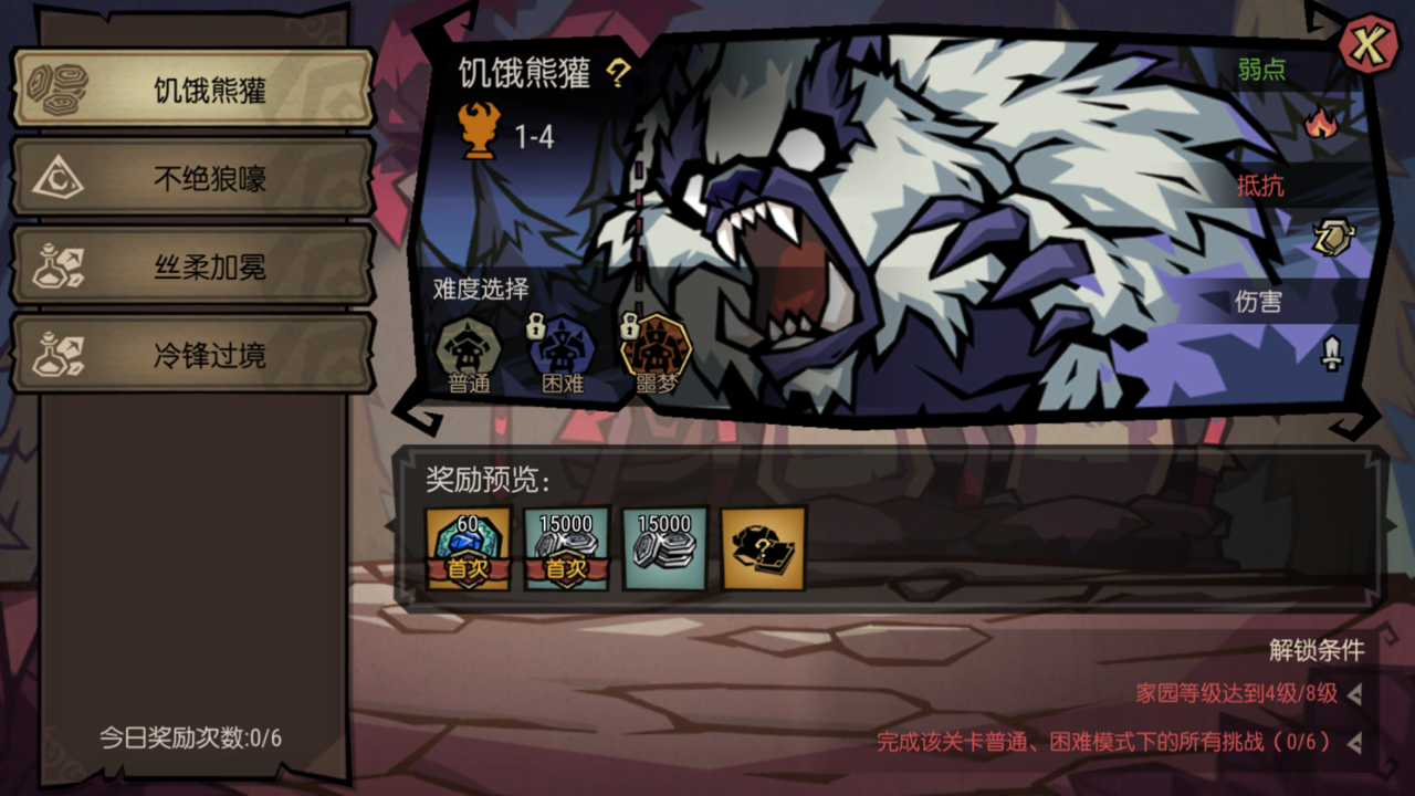 困难模式需要家园等级达到6级,通关普通模式后才可解锁。
