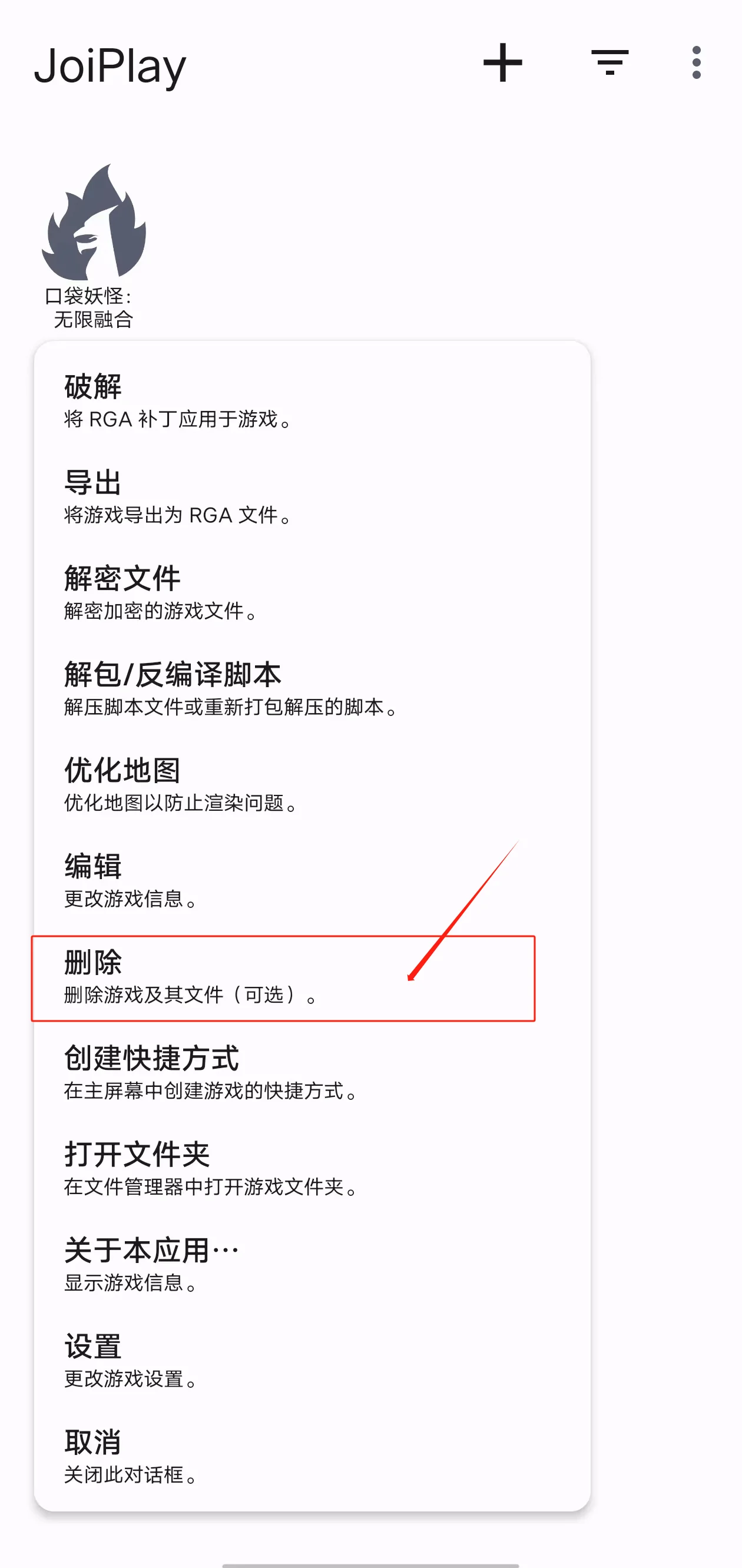 可在【JoiPlay】主界面长按【游戏图标】选择【删除】并勾选【精灵宝可梦无限融合5.0.36】文件,大致需要等待30分钟左右(需保证运行,切换后台可能会影响正常删除);
