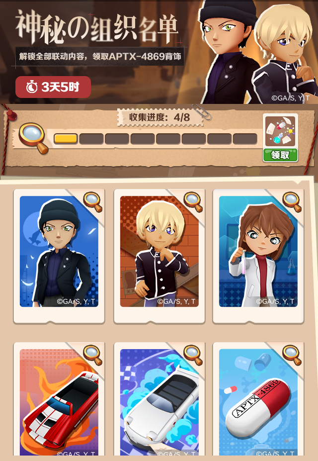 每获得一个柯南的联动角色/背饰/滑板即可解锁对应卡牌,解锁全套卡牌即可获得背饰APTX-4689。