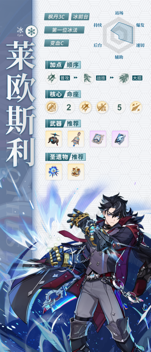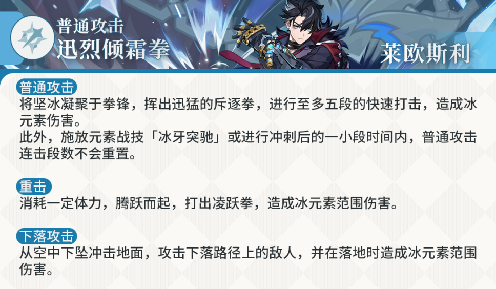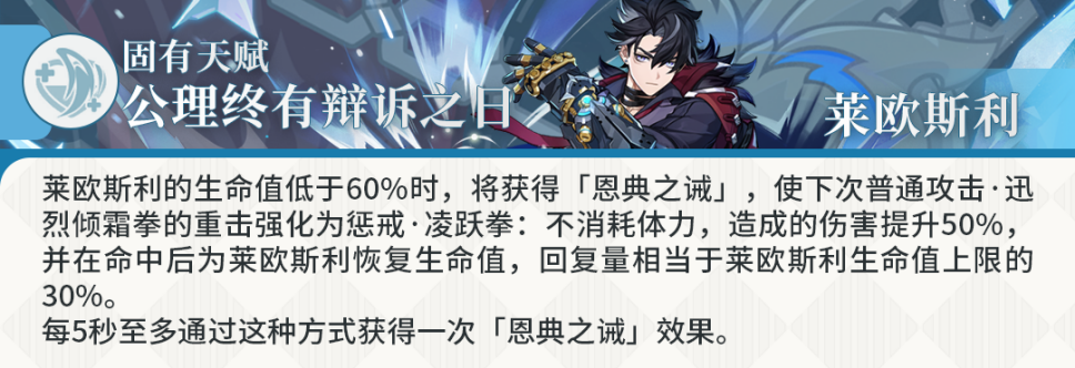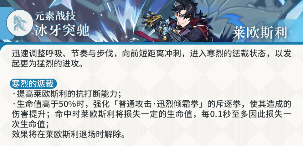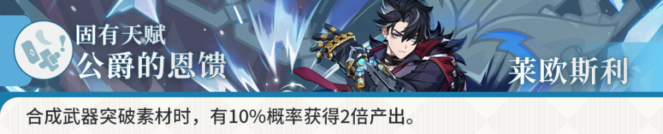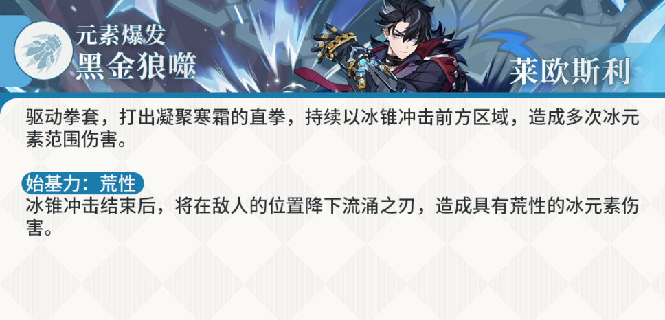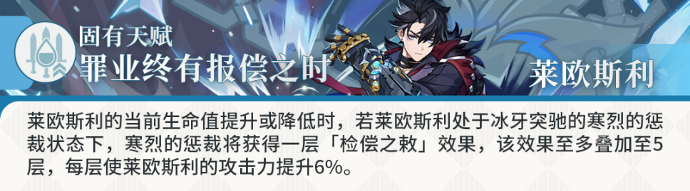 新卡池已经上线,梅洛彼得堡的公爵——莱欧斯利即将加入旅行者的队伍,不知道大家有没有做好准备带莱欧斯利回家呀?就让苏阳带大家一同深入了解莱欧斯利的技能机制、养成材料、加点建议、武器推荐和实战配队吧!莱欧斯利是一名冰元素法器角色,始基力为荒性,定位是驻场普攻输出型角色。他的主要输出手段为经战技强化的、共计五段的普通攻击「斥逐拳」,他的战斗特点是强化普攻烧血、强化重击回血,且施放战技或冲刺不会重置普通攻击连击段数。莱欧斯利是攻击力输出角色,其主要技能天赋均为攻击力倍率。80级突破后暴击伤害加成38.4%,符合一般五星输出角色模板。