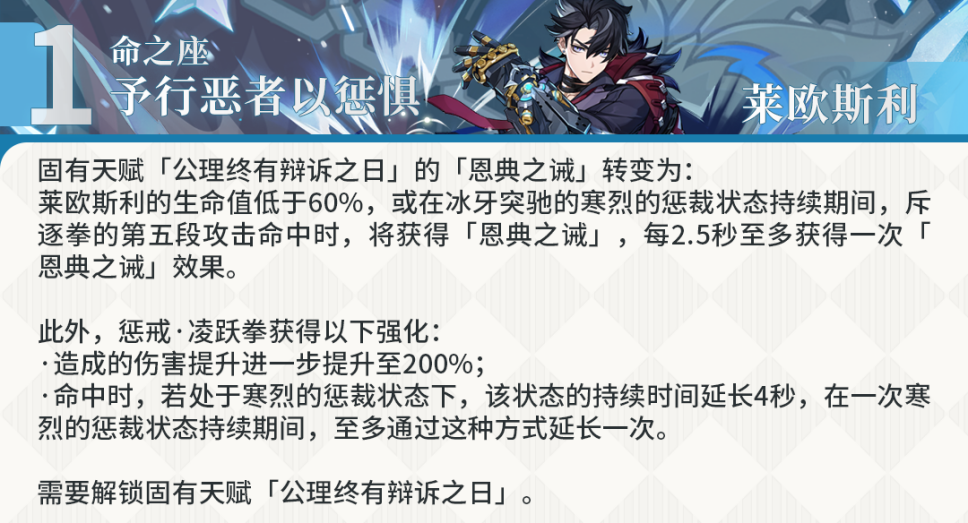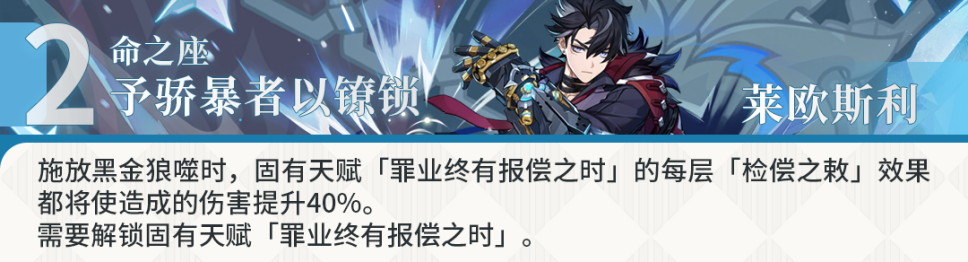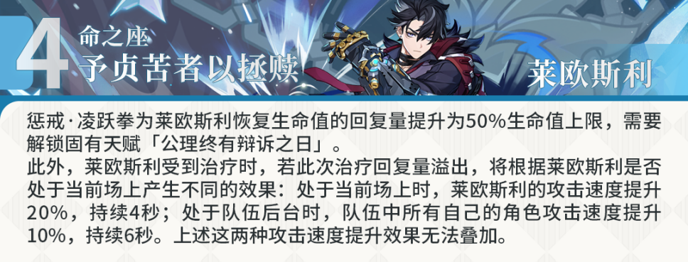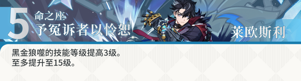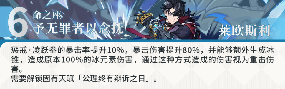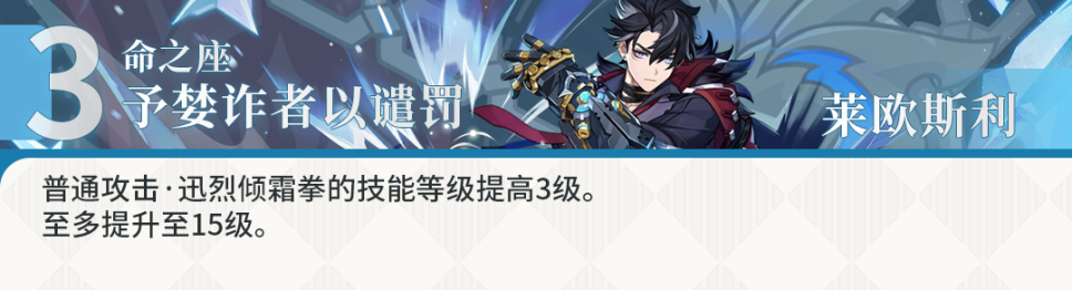 解析:省体力小天赋,绫华同款。解析:莱欧斯利的核心命座,玩法优化提升。该命座大大改善莱欧斯利的生存和输出,简化操作逻辑,不再需要低血量才能强化重击回血,回血CD也大大缩短。且重击所获伤害提升大幅提高,还能延长强化普攻持续时间。它和「普攻段数不重置」是联动机制,使得莱欧斯利可以很方便地打完一套普攻即获得重击强化。解析:朴实无华的大招增伤。解锁二命后,莱欧斯利的大招爆发能力进一步提高,到了一个值得重视的程度。但开局即放大依然是吃不到加成的,需要打完一套强化普攻再开大,才能吃满高额增伤。解析:朴实无华的普攻倍率提升。由于强化普攻是莱欧斯利主要输出手段,因此这个命座也很有用。