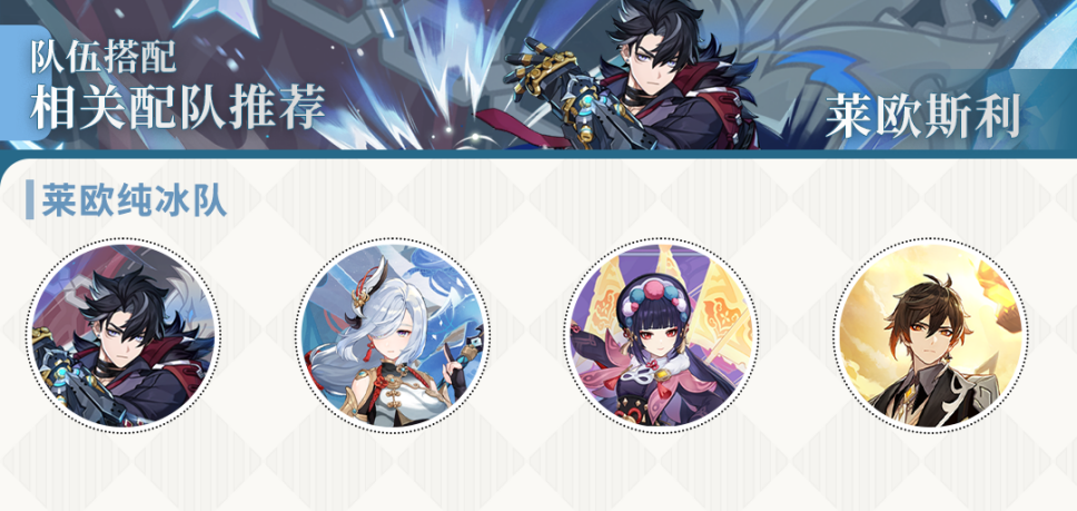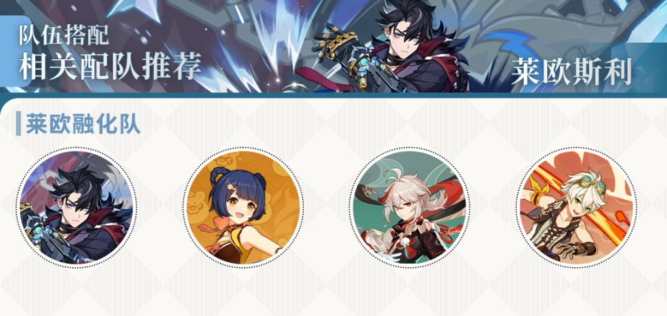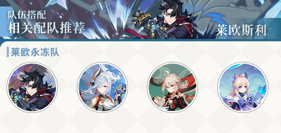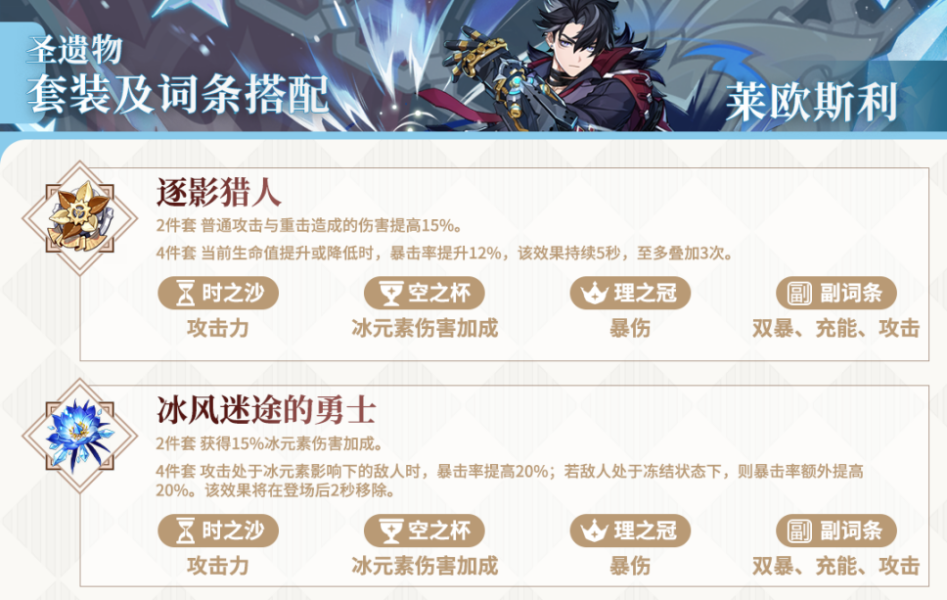 鉴于莱欧斯利是枫丹角色,且有枫丹特色烧血和自回血,因此第一建议当然是【逐影猎人】套装。解析:完全适配莱欧斯利的圣遗物套装,无论是融化队、永冻队还是纯冰队都完美发挥。解析:部分适配莱欧斯利,在永冻队中最优先推荐的圣遗物套装。遗憾的是不适合莱欧融化队,在面对某些自挂元素的怪物(如小马珍珠)时几乎是白板。※针对莱欧斯利的套装推荐,我们给您的主词条选择建议是:【时之沙】攻击力【空之杯】冰伤加成【理之冠】暴击伤害【暴击率>暴击伤害>攻击力≈元素精通(融化队)≈元素充能效率(130%+)】前文已经提到莱欧斯利当前有融化、永冻和纯冰三种上限较高的玩法。此外莱欧斯利还可以作为超绽(纳行久)的驾驶员,下限稳定,具体不再赘述。解析:类似万达的玩法,不同的是这套配队打得是融化反应。莱欧斯利普攻遵循2.5s/3hit弱冰附着的规律,大招共能触发两次融化,重击则是次次融化。此外,还可以把香菱换成纳西妲,变成燃烧融化队。莱欧斯利享受草神和万叶的精通加成,可以进一步提高莱欧斯利的融化伤害。输出手法:莱欧斯利E+5AZ*3(5次普攻+1次重击,共循环三轮),可通过冲刺取消重击后摇。如果氪佬有满命申鹤,这个配队上限会进一步拔高。申鹤六命效果是普攻重击不再消耗冰翎,对莱欧斯利来说,几乎相当于白嫖了十几拳冰翎加成(但冰翎自身存在持续时间限制且大招仍会消耗,因此依然需要申鹤长E补冰翎)。没有申鹤的旅行者可以使用米卡,米卡在莱欧队中的作用是攻速拐。别小看米卡给的攻速加成,他能让莱欧斯利在强化普攻的持续时间内多打好几拳,是实打实的伤害提高。输出手法:莱欧斯利E+5AZ*n(米卡、专武、一四命均可提升莱欧斯利强化普攻次数),可通过冲刺取消重击后摇,有大放大。冰元素辅助申鹤,和普攻辅助云堇的组合,可以极大提升莱欧斯利的强化普攻伤害。队伍触发双冰共鸣和双岩共鸣加成,提升暴击率和伤害加成。这个配队申鹤同样可以换米卡,米卡和满命云堇都可以提升莱欧斯利的攻击速度,配合专武的攻速提升,莱欧瞬间化身白金之星欧拉欧拉欧拉。输出手法:莱欧斯利E+5AZ*n(满命云堇、米卡、专武、一四命均可提升莱欧斯利强化普攻次数),可通过冲刺取消重击后摇,有大放大。全文较长,辛苦各位旅行者一路阅读到此,给看到这里的小伙伴们点个赞!本文到此结束,不耽误大家给公爵大人刷材料的时间了~