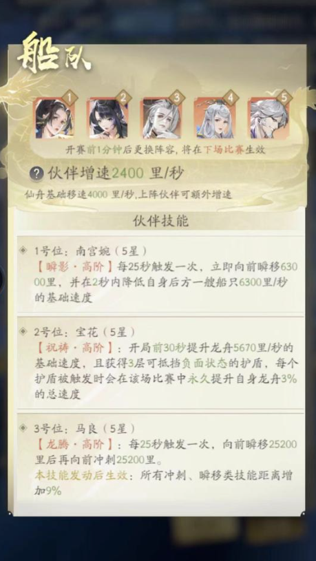 阵容理想状况分析:南宫婉开局瞬移并减后1仙舟速度;宝花被动的3个护盾免疫减速的同时可以加速;马良增加冲刺、瞬移类距离;(如果冲出去基本上就前2了)凌玉灵减2s的CD,配合马良的技能可以最大限度的套瞬移类的加成;呼庆雷提升基础速度,可以增加前面冲出去的概率。
