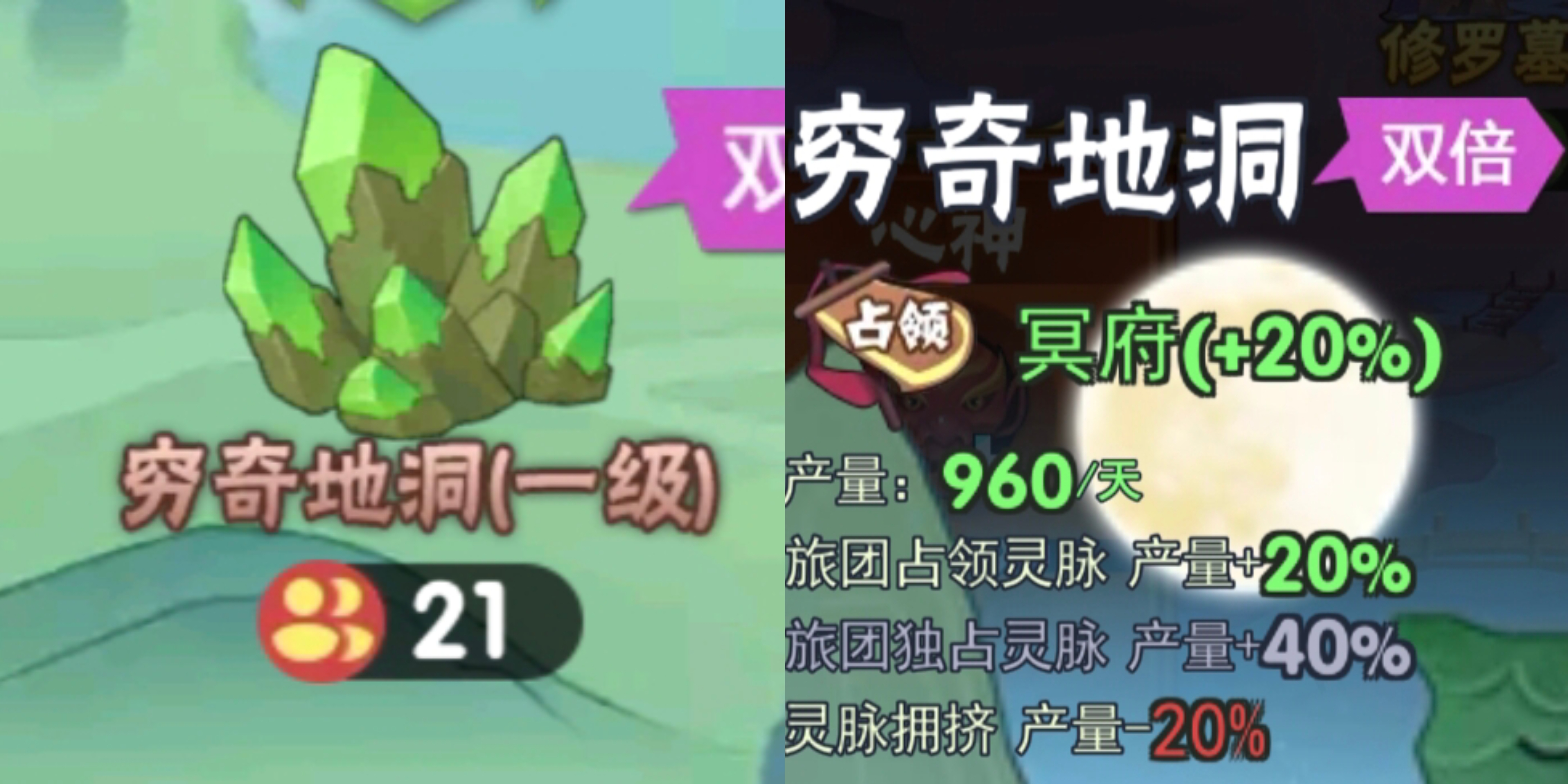 比如:这个1级灵脉【穷级地洞】驻扎人数为21个人。则灵脉造成拥挤,所以产量–20%。