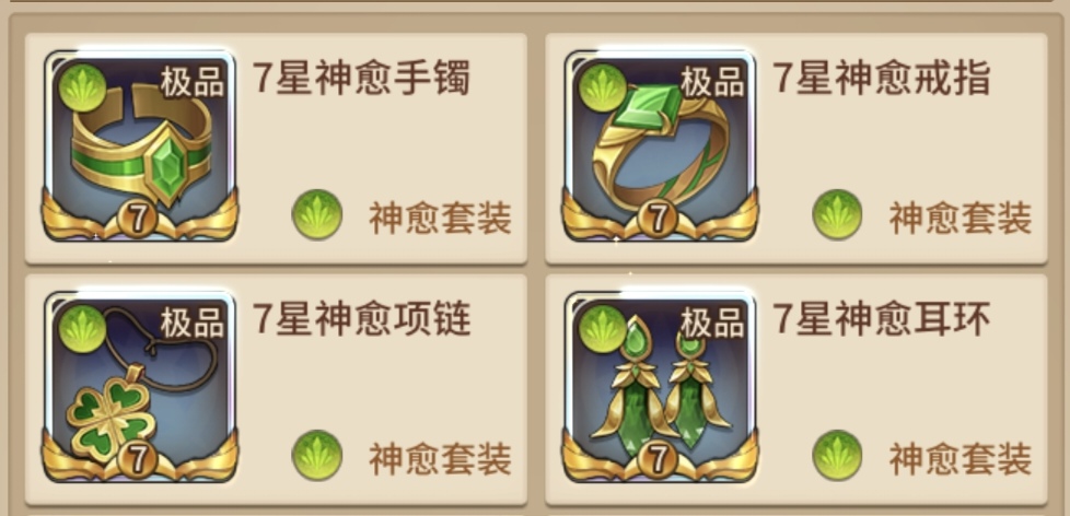 七星神愈效果:治疗时,目标获得等同治疗量28%的护盾(该效果不可被驱散)持续2回合; 50%概率触发大成功,该护盾值翻倍。大奶辅助英雄适合携带,如酒神、大祭司、火牧等。但这套神装牵扯到一个顶盾机制的问题,部分情况下会顶掉部分护盾,如佳瑶的盾,PVP盾,这个需要自己平常多注意。选择的时候需要谨慎一点,一般携带比较多的就是魔械辅助和阿蒙,用于提升治疗和获取护盾。