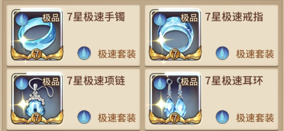 七星极速效果:战斗开始前4回合,对自身附加极速效果,提升自身200点速度,持续4回合且不可被驱散每场战斗只可触发1次。极速神装是使用频率最高的一套神装,18%的速度加成对于许多英雄都是非常关键的,法师队整体倾向于高速路线(内战需要极速套,外战龙威狂怒套,但坦辅英雄固定需要2套极速神装);打控制的英雄,如盘古、塞壬、亚巴顿、奥巴马魔械师等都需要;部分辅助英雄可以走高速路线(防止被控,让金队吃到攻暴加成),如女娲、娜迦、圣罚祭司、拉斐尔等。个人建议玩家应该养1~2套六星,很多情况下可以用得上。