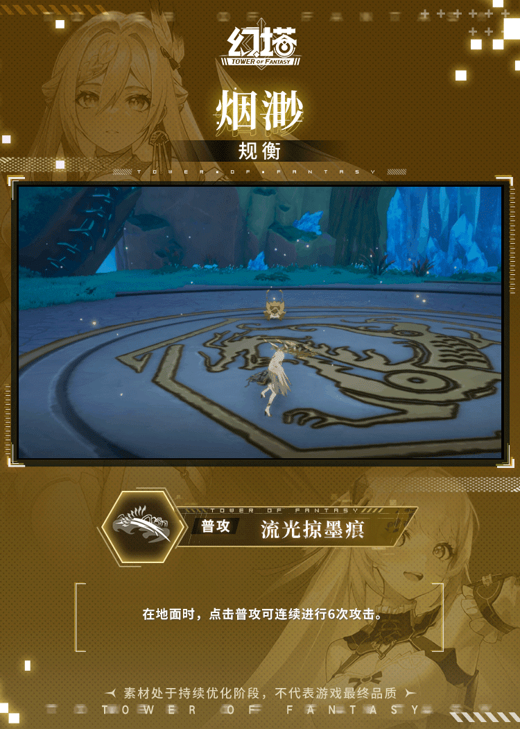 在地面时,点击普攻可连续进行6次攻击。当拓荒者滞空时,点击普攻可连续进行6次攻击,并消耗耐力。在地面使用第2次普攻后,长按普攻可触发蕴境一世界,向地面掷出规衡,造成伤害并使目标浮空。当拓荒者滞空使用普攻时,长按普攻可触发明月叶飞落,落地后对附近目标造成伤害并击飞,规衡扩散与收束期间轻微拉扯附近目标造成伤害。
