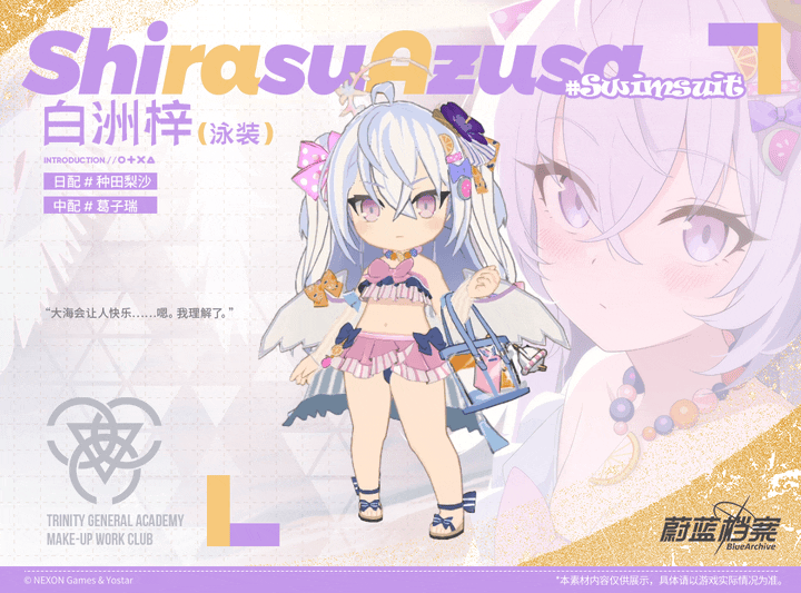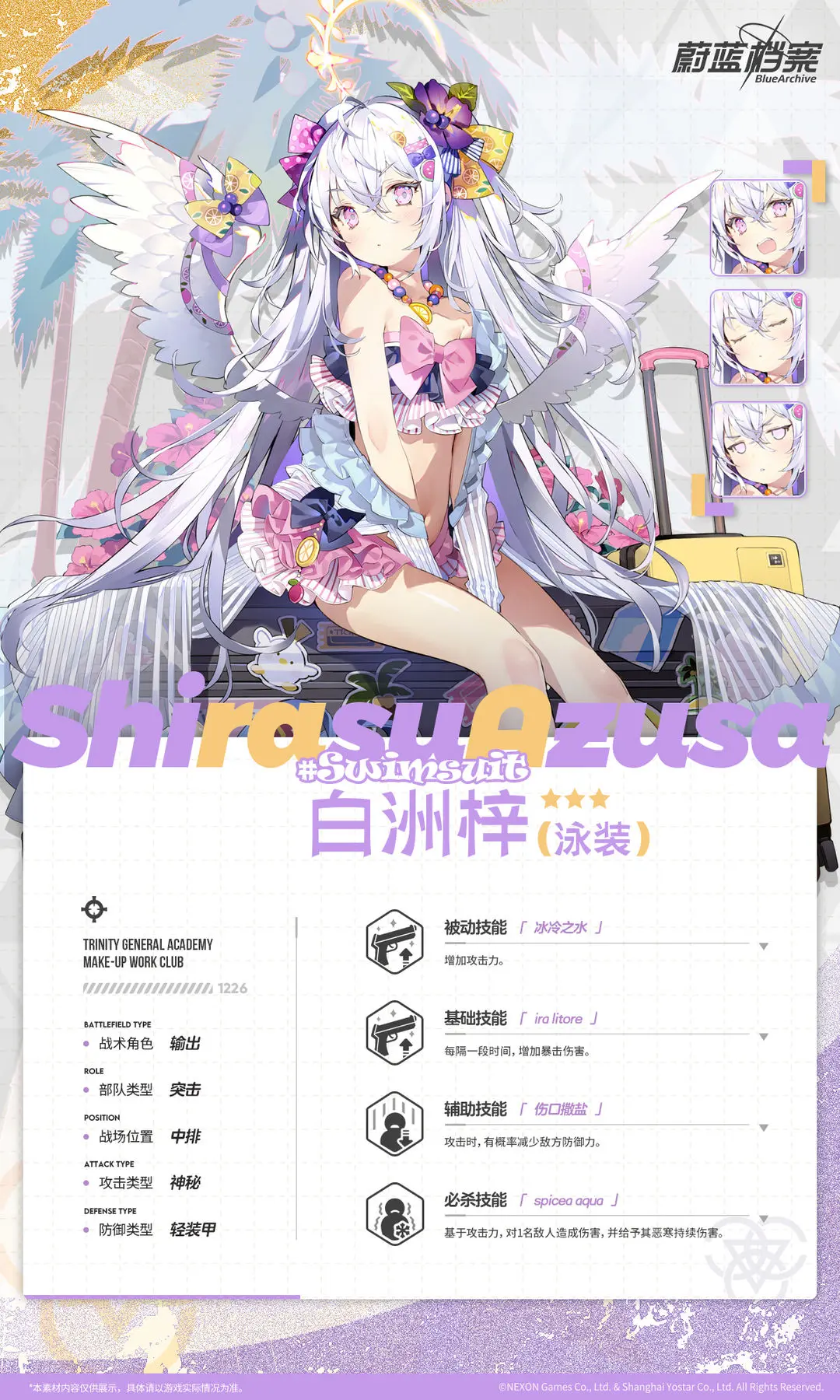 【新增人物档案】白洲梓(泳装)光环资讯 - 二次元发布于 2023-10-22关注 //////////档案启封//////////■白洲梓(泳装)第一次来海边玩,补习部的冰冷魔女。虽然为了不给别人添麻烦,平时总是试图维持一副冰冷的样子,但在不经意间被海滩快乐的气氛和与她同行的朋友们所影响,因此开始特别在意别人的视线。但在别人看来,她依然是那个熟悉的梓。“大海会让人快乐……嗯。我理解了。”