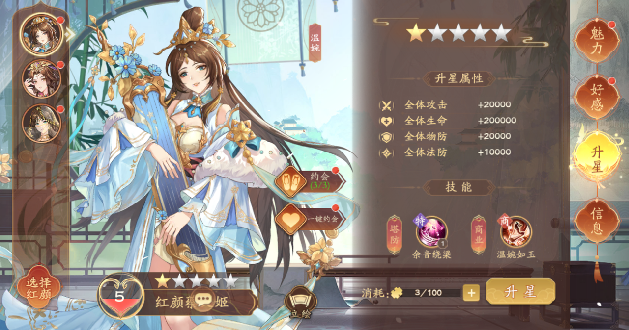 ✦红颜资质分为5个阶段:平、良好、优秀、卓越、完美,提升资质至一定阶段(200/400/800/1600/3200)会提升资质评级,评级越高,转化对应的属性倍率也越高。