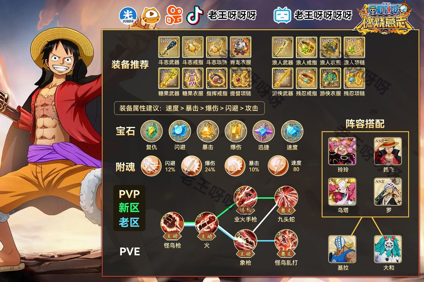 目前新区老区的玩法可能有些不同,因为新区的乘胜追击和老区的乘胜追击是不一样的,老区有额外行动和加速度,新区只能加速度。目前路飞保命主要还是魂玉机制的无敌和闪避,所以路飞可以玩两种流派:高速或者闪避(下面的推荐都是按这个思路来的!)