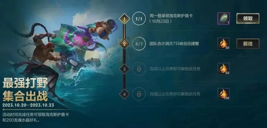除此之外,登录有礼活动对应的“最强打野 集合出战”活动即将在今日结束,召唤师记得抓住最后的机会,完成对应任务领取海量龙魂水晶奖励哦~