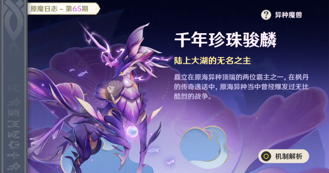 Hello大家好鸭,这里是C茉~!原海异种当中曾经爆发过无比酷烈的战争,只留下两位霸主在大湖南北分庭抗礼,第一位已经介绍过了,是「铁甲熔火帝皇」,于是乎第二位矗立于原海异种顶端的霸主也揭开了它的真面目——「千年珍珠骏麟」。【目录】