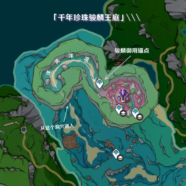 从黎翡区中部锚点开始,往西北游到图示指示位置洞穴,进入洞穴后会有洋流,随波逐流,游出即可看到一个专属锚点,再走一会可见千年珍珠骏麟。