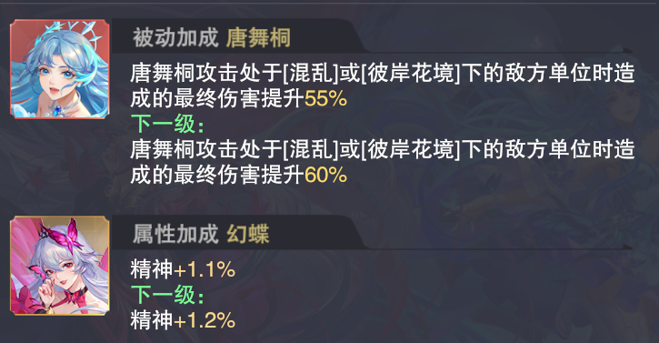 首先大家都知道幻蝶是需要搭配SP尘心才会起到更好作用的,但这里大家也稍微忽略了一点她PVP上的暗示,因为在官方的设计思路中,同属蝶属性武魂的唐舞桐与幻蝶之间也会有羁绊关系,咱就先不说唐舞桐的PVP价值有多高,就单看这个11级便能提升60%最终伤害的效果,在契合关系方面也算是不错的增伤程度了。