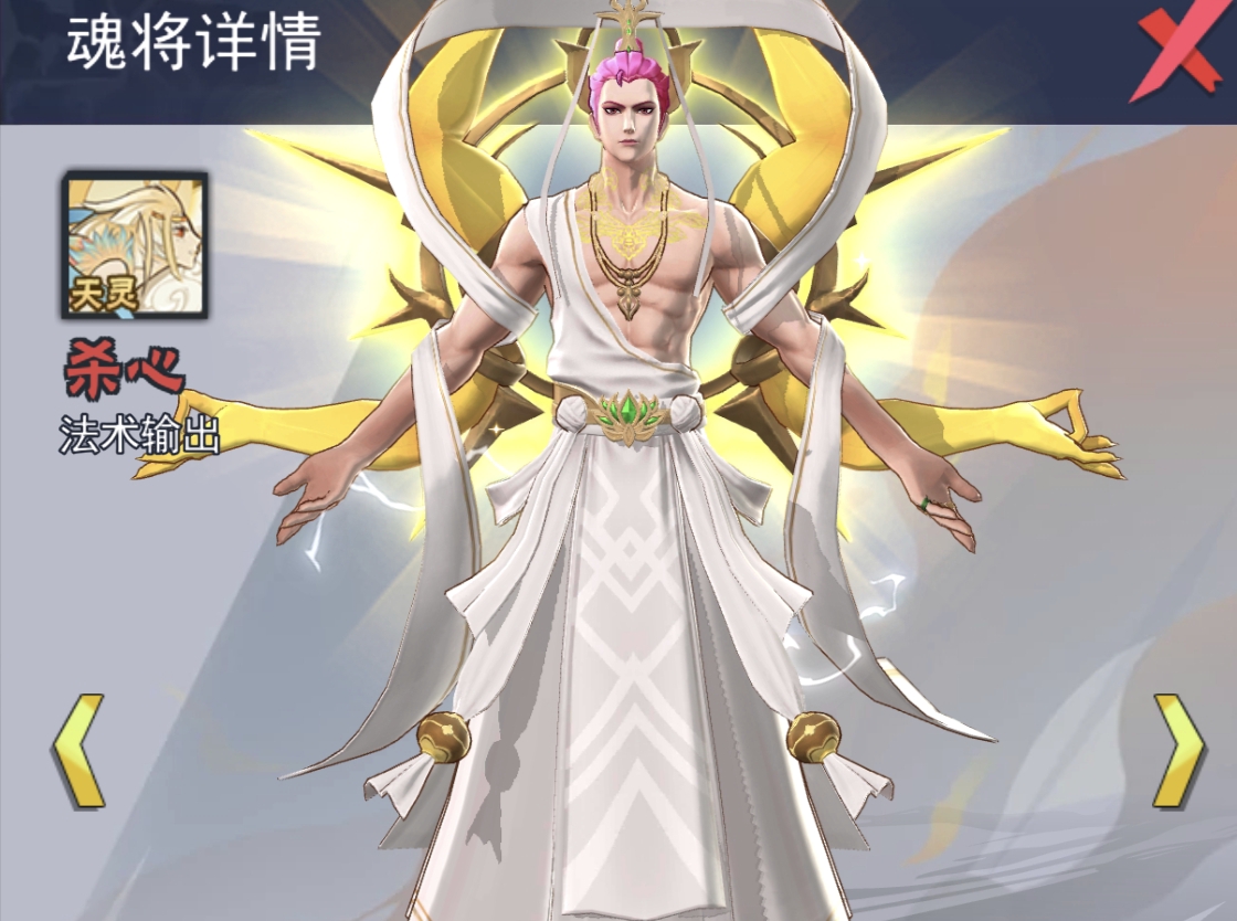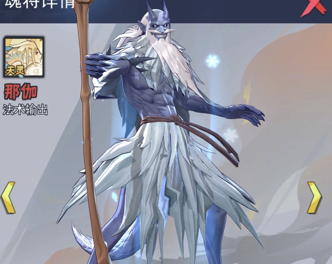 解析:和如来一样,是天阵容的核心输出之一,也是热门的输出魂将,全体aoe法术伤害,和那伽搭配形成全体aoe法伤流。并且每次释放技能以后也会追击一次普攻,和如来搭配双普攻流,适合收割残血敌人。非常百搭的输出。搭配上专属法器,生命越低,伤害就越高。