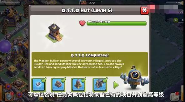最令人兴奋的更新肯定要留到最后介绍呢,九本更新了一个小机器人,就是替代建筑大师的OTTO,开发者终于终于给我们孤独寂寞的建筑大师一个陪伴了(海尔哥哥表面上是在为建筑大师开心,实际上是为了六农而开心)。玩家们需要建好OTTO小屋才能解锁OTTO, 完成特点的任务,将小屋升至5级就能解锁这个好用的小机器人。配合上这个OTTO机器人,建筑大师才能离开夜世界,赶往主世界去帮助主世界的另外五个兄弟去完成他们的工作,而OTTO机器人就会替建筑大师在基地上进行建造工作。OTTO机器人的出现,宣告了部落冲突正式进入六农时代。