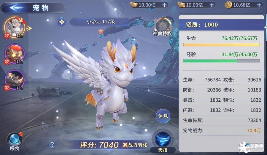 宠物评分受资质+天技影响,评分越高的宠物代表越强。正在战斗的宠物视为主战宠物,人物做人物获得经验时,宠物也会获得经验,也可消耗宠物经验丹进行升级(所有宠物共享一个等级)。