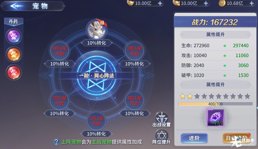 阵法功能会为主战宠物带来进阶属性和转化属性加成。提升进阶属性需要消耗阵法石对阵发进行升阶,该属性对主战宠物一直生效。提升转化属性需要开启阵法槽位后,将宠物上阵到该槽位中才生效。上阵宠物属性越强,阵位转化比例越高,抓主战宠物得到的加成越多。