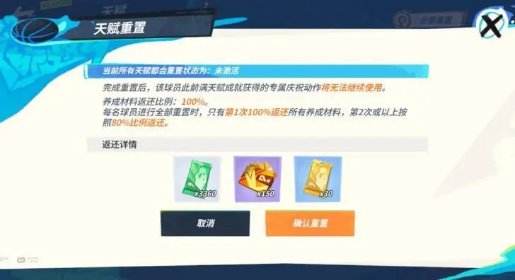 -球员的天赋养成增加重置功能,每名球员第一次重置时100%返还此前消耗的养成材料;第二次及以上次数则只返还80%的养成材料;其中巨星球员天赋养成所消耗的巨星专属天赋卡,重置后将以巨星天赋卡自选包的形式返还。