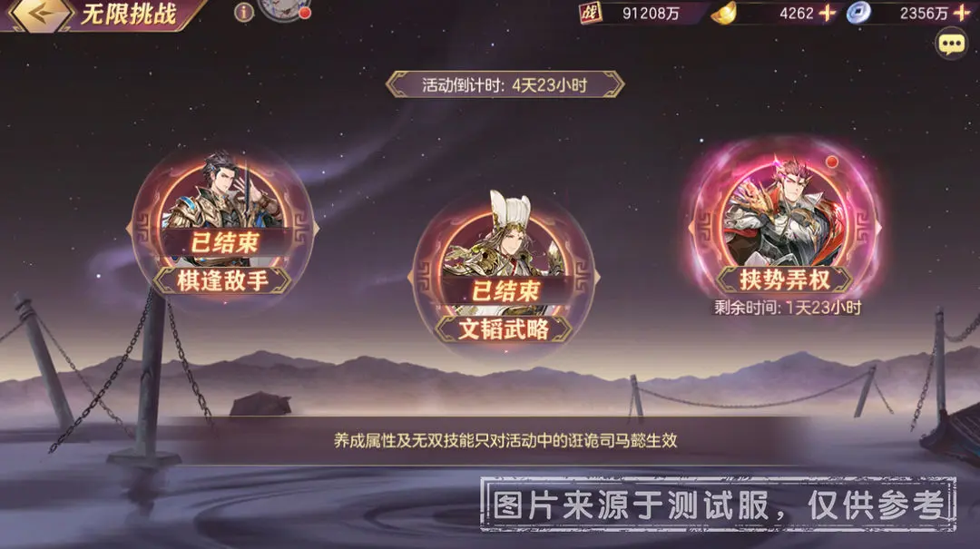 1、【权术七计】活动中的【养成】模块加成,仅对活动内(包含无限挑战与幻境试炼)的玩法有加成效果,对活动外模块无效果。该加成效果将在活动结束后重置。
