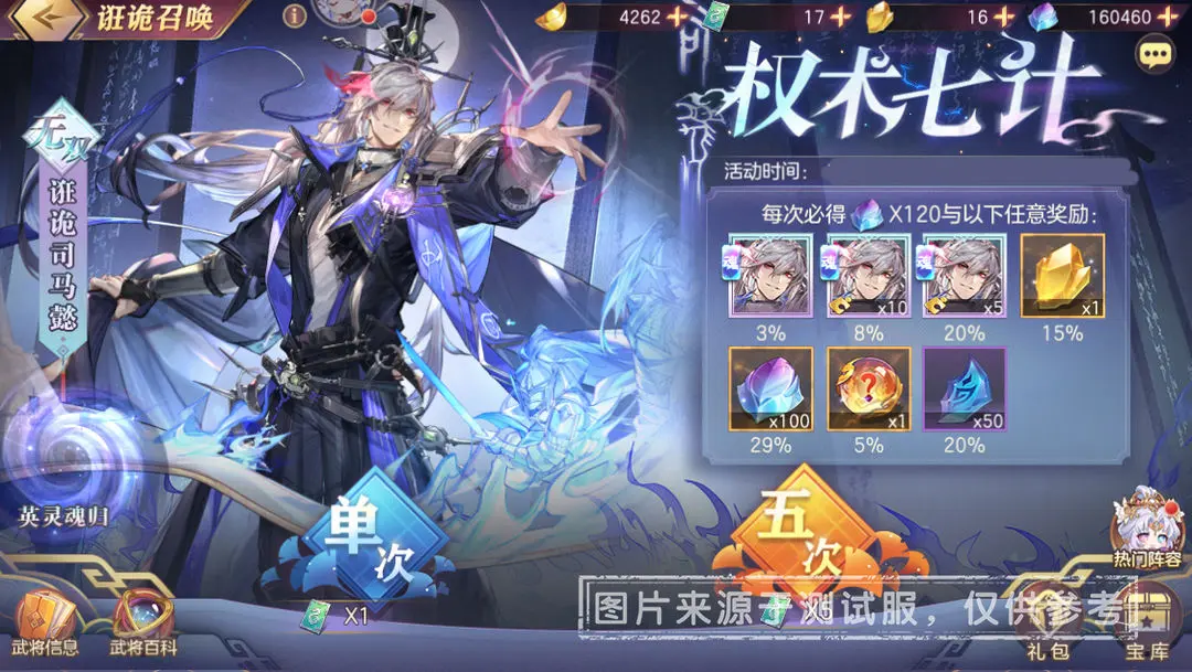 活动期间,通过【主界面左侧入口】即可进入「魂将-诳诡司马懿」的专属活动【权术七计】,自选关卡条件的无限挑战、活动专属的限时养成,并且多达70关的幻境试炼关卡,将给小将军带来全新的策略玩法体验!参与活动即可将「魂将-诳诡司马懿」领回家!