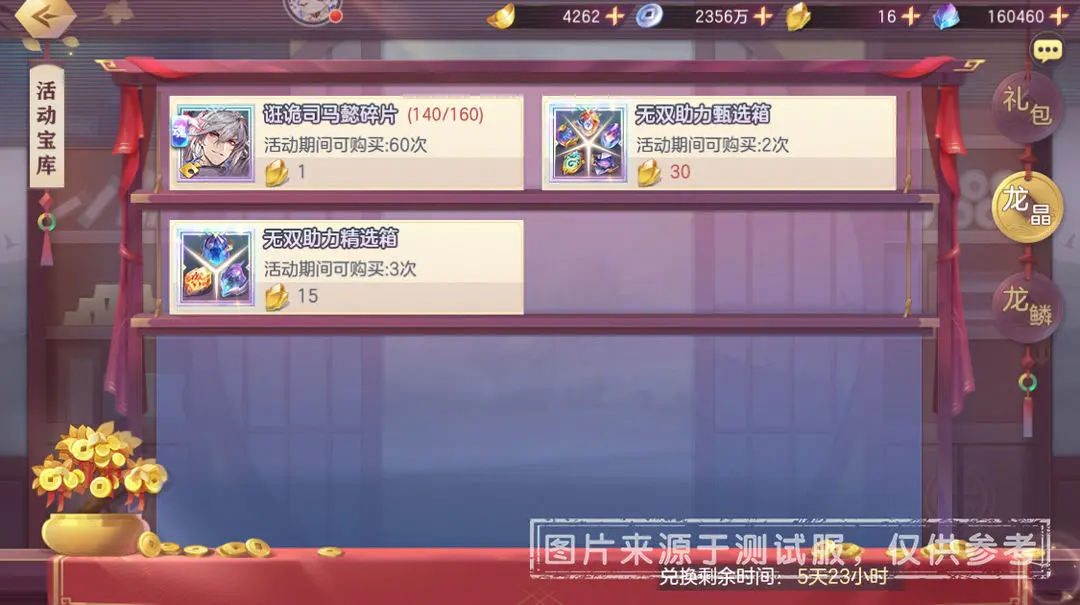 在【权术七计】活动中获得的稀有兑换代币「龙晶」,可在活动宝库中兑换「诳诡司马懿碎片、无双助力甄选箱、无双助力精选箱」等稀有宝物;