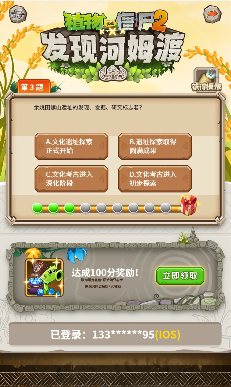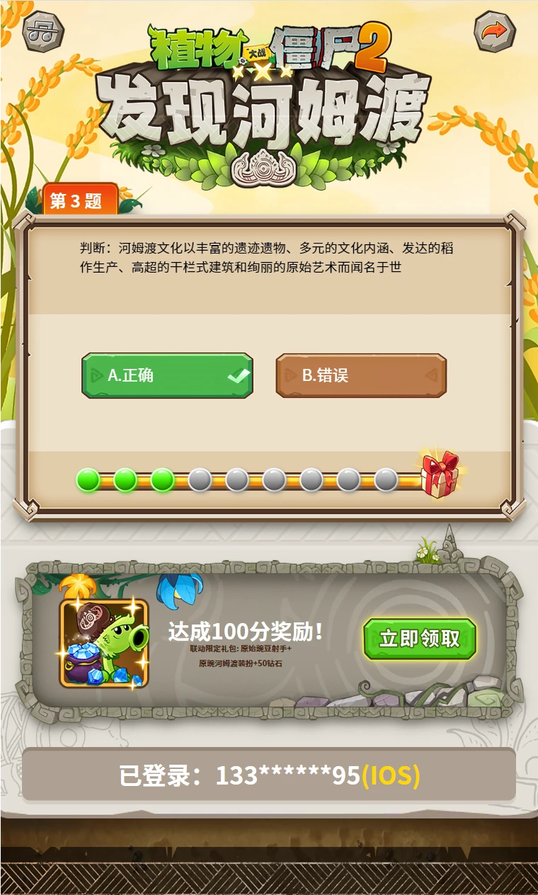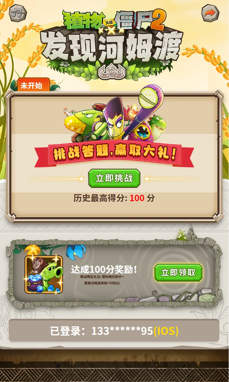 5、活动期间,在任意一次答题中成功达成 100 分,即可获得联动奖励礼包的获取资格,获得原始豌豆射手河姆渡联动装扮、原始豌豆射手、钻石等奖励,奖励以礼包码形式发放,在兑换时间内可至游戏内进行兑换领取,每个游戏账号仅限领取一次联动礼包码奖励;