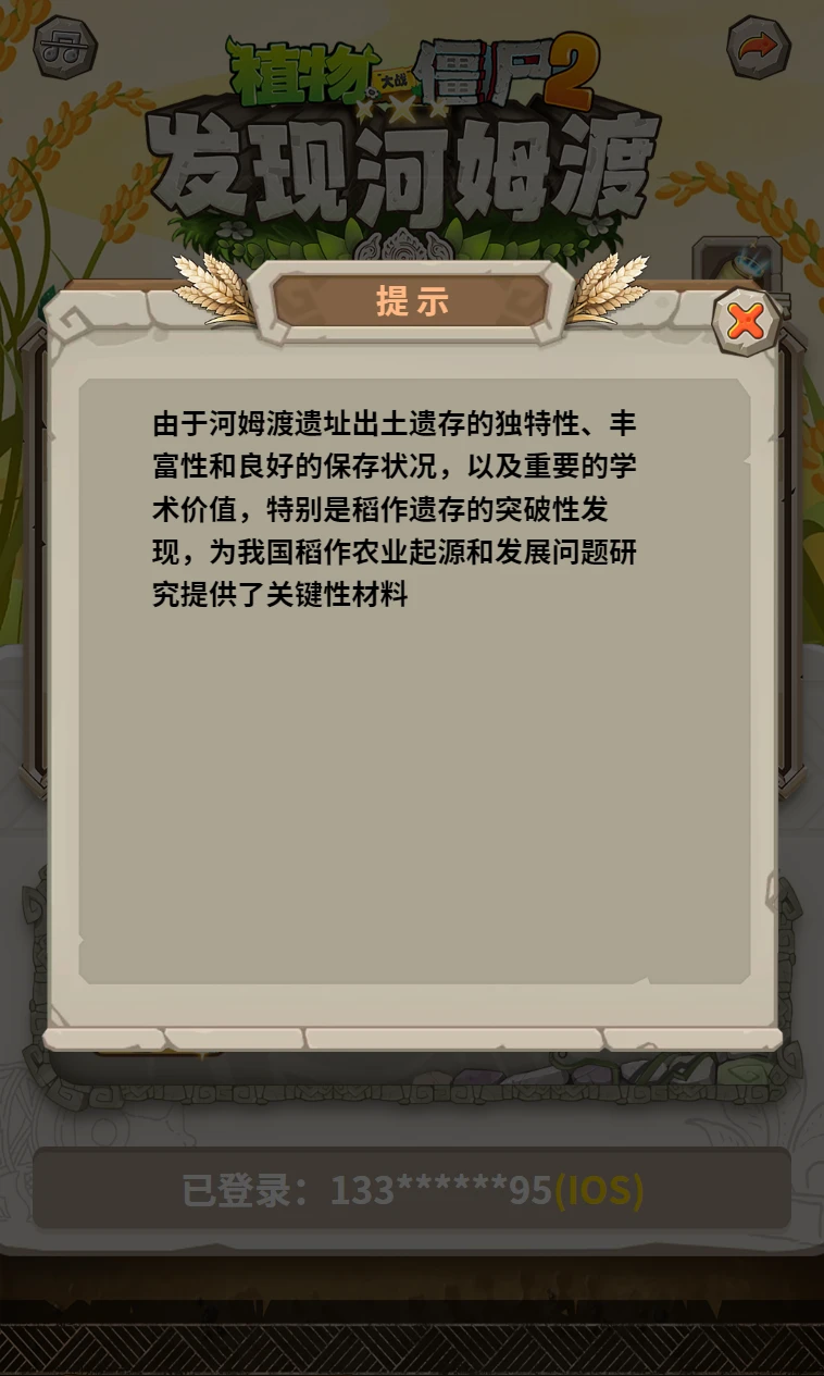 感谢大家对《植物大战僵尸2》和“河姆渡文化”的支持,本次“发现河姆渡”联动版本,是《植物大战僵尸2》在游戏合作之后的首次“跨界”尝试,是制作组在文化推广领域迈出的重要一步。《植物大战僵尸2》作为在中国拥有破亿用户的知名IP,应当担起优秀文化的传播责任,将祖国的大好河山和历史瑰宝展现给游戏玩家。期待每一位小僵僵都能够在本次联动版本中,学习历史,接触传统文化,收获宝贵的知识财富。 疯狂戴夫的“河姆渡”之旅即将启程,准备出发!