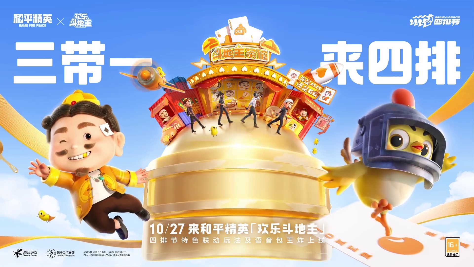 和平精英惊喜联动欢乐斗地主 ,特色玩法及语音包王炸上线!光环-小Y发布于 2023-10-26关注三带一,来四排!和平精英惊喜联动欢乐斗地主 ,特色玩法及语音包王炸上线!「斗地主茶馆」空降海岛!上桌领头套,速来抢“地主”!「欢乐豆」升级金袋子爆物资,让快乐超级加倍! 再干一杯卡布奇诺!状态满满开启海岛快乐局!「定制斗地主语音包」一起开麦交个朋友! 10月27日,快上车,一起组队开心四排! 00:06