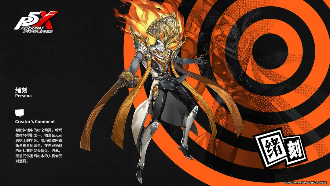 INDEX全书 | 人格面具 |『绪刻』介绍女神异闻录:夜幕魅影 - 新闻星发布于 2023-10-26关注>>>PERSONA!『绪刻』介绍 希腊神话中的树之精灵,哈玛德律阿得斯之一。栖息在无花果树上的宁芙。哈玛德律阿得斯与树共同诞生,在自己栖息的树枯萎后就会消失。因此,无意间伤害到树木的人将会受到惩罚。————觉醒,面具之下的你!————