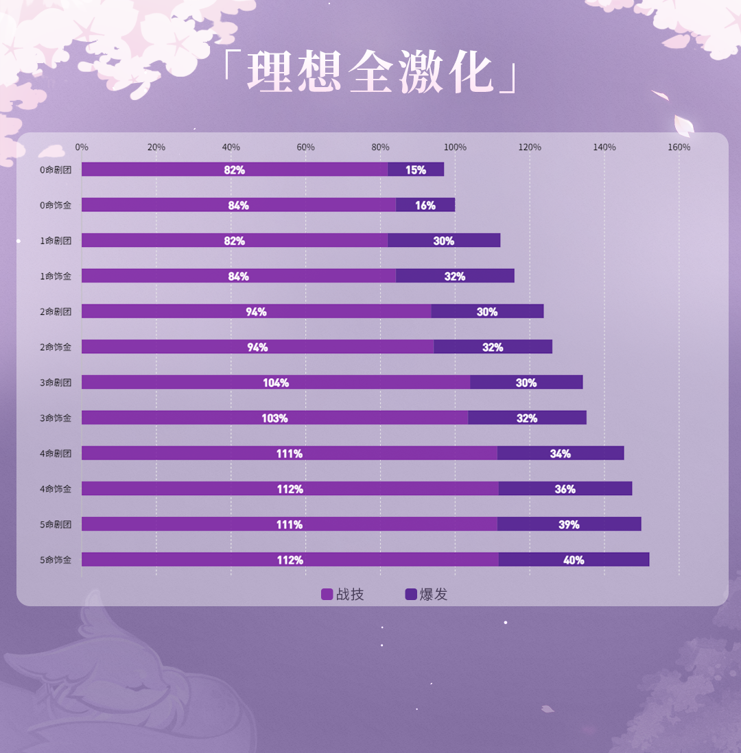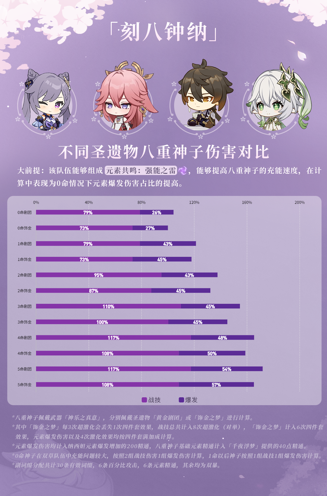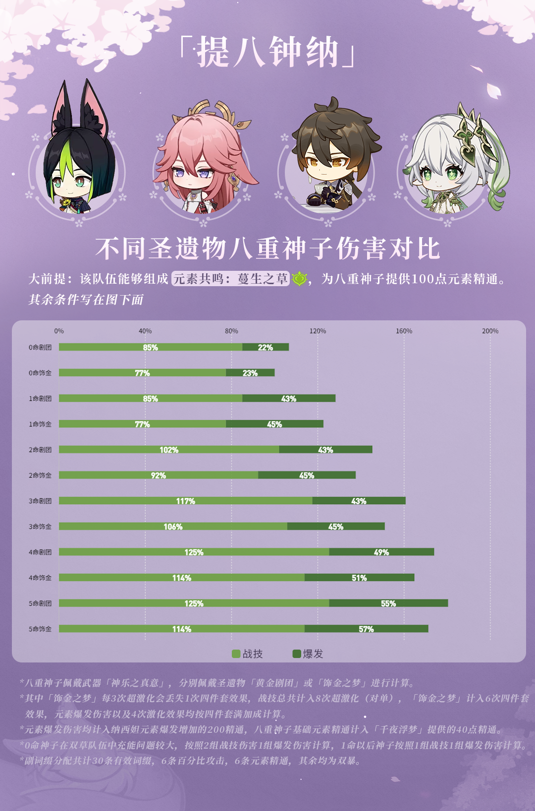 原神·圣遗物丨4%提升就不要刷了?——八重神子新旧圣遗物刷取性价比讲解原神 - 新闻星发布于 2023-10-26关注 「黄金剧团」是一套极致强化「元素战技」伤害的圣遗物,而「八重神子」作为主打元素战技伤害的角色,该套装与其也有非常不错的契合度。但新圣遗物均要考虑对比旧圣遗物的提升,且对八重神子来说,不同命之座的情况下战技/爆发的占比不同,因此还是需要具体情况具体分析。你的神子还需不需要刷,看完本文告诉你~~ ◎图中以0命神子佩戴「饰金之梦」为100%基础进行数据对比展示,可以看到无论几命,「黄金剧团」都有微弱的优势。◎点亮1命后优势略微减小,这是因为1命增加了「元素爆发」的伤害占比,而剧团只能加成「元素战技」的伤害所导致。◎点亮2命与3命都会再次扩大「黄金剧团」的优势,这是因为2/3命均是提高「元素战技」的伤害倍率,很明显能看到战技的伤害占比大幅提升,因此剧团套的高额战技加成也得以放大。◎点亮4命与5命后的优势也会略微减小,4命的增伤对高额增伤加成的剧团套来说显然比起饰金套稀释的更严重一些,因此二者差距减小;5命增加「元素爆发」伤害占比,导致变化的原因与1命相同。小结:在双草共鸣的队伍中,随着命座的提升,「黄金剧团」的优势变化区间在6%~10%之间。这是由于有共鸣所提供的100点元素精通,因此饰金套的高精通优势会因此变小。 ◎可以看到,「黄金剧团」还是有微弱的优势,不过在双雷队伍中,因为没有双草共鸣的精通加持,且有双雷充能带来的元素爆发伤害占比的提升削弱了剧团套的优势,因此二者差距进一步缩小。◎随着命座的点亮带来的变化与双草队伍相同,此处也不重复叙述。小结:在双雷共鸣的队伍中,随着命座的点亮,「黄金剧团」的优势变化区间在4%~7%之间。上述两个队伍的反应结算均为对单的情况,在对群时,激化的覆盖率会有所提升,下图是比较理想的“全激化”情况时,两个套装的对比。 ◎可以看到,如果八重神子的所有攻击均触发“超激化”反应,则「饰金之梦」在0命时比起「黄金剧团」就有一定优势,在1命时差距达到最大4%,后续(姆)命座影响基本上让差距在2%~3%左右徘徊。小结:在全部触发激化反应的情况下,「饰金之梦」的优势也比较微弱,可以预见对群情况下,二者的表现基本持平。对单就参考双雷/双草队伍中的表现。「超激绽」此外,八重神子的队伍还有驻场流「超激绽」玩法,这种类队伍相比于上述两个“元素精通”只有“超激化”收益的队伍,多了“超绽放”这一额外收益,且驻场触发“绽放”会让「黄金剧团」四件套收益降低,因此这类玩法毫无疑问是佩戴「饰金之梦」最佳。「纯雷伤」纯雷伤的队伍中,基本上不存在风元素扩散以外的反应,因此「饰金之梦」的精通收益大大降低,此时显然是「黄金剧团」更佳。总结:队伍角色/元素共鸣能提供较多“元素精通”数值且敌人较少时「黄金剧团」占优,反之,「饰金之梦」占优。此外,八重神子命之座数量越多时,「黄金剧团」优势也越大。我个人推荐2命以上的八重神子即可考虑刷取「黄金剧团」。 很多满命满精八重神子的旅行者会想,满精「神乐之真意」给的战技增伤那么高,「黄金剧团」还会有优势吗?即使是满命满精八重神子,在双雷这样没有太多额外精通加成的情况下,对单时「黄金剧团」依然有7%左右的优势,对群时只要超激化覆盖率不超过80%,「黄金剧团」依然小优。怎么说呢,虽然很多旅行者可能已经刷取了不错词缀数量的「饰金之梦」套装,不过「饰金之梦」也有许多合适的“激化大C”能够佩戴,不用担心神子迭代后没有角色使用,考虑到后续的枫丹新角色都会围绕「黄金剧团」的副(主)产物「逐影猎人」展开,因此我认为可以放心的进行圣遗物的刷取与迭代。作者:原神西风驿站,墨菊