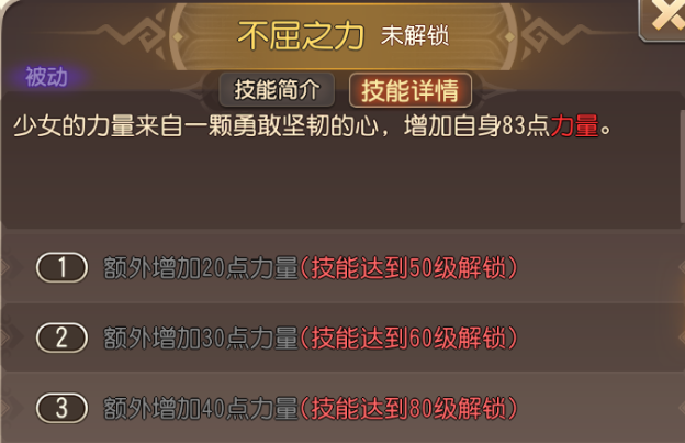 四技能——不屈之力,不过多赘述了,增加力量数值,加强身板的强度,为2技能服务。