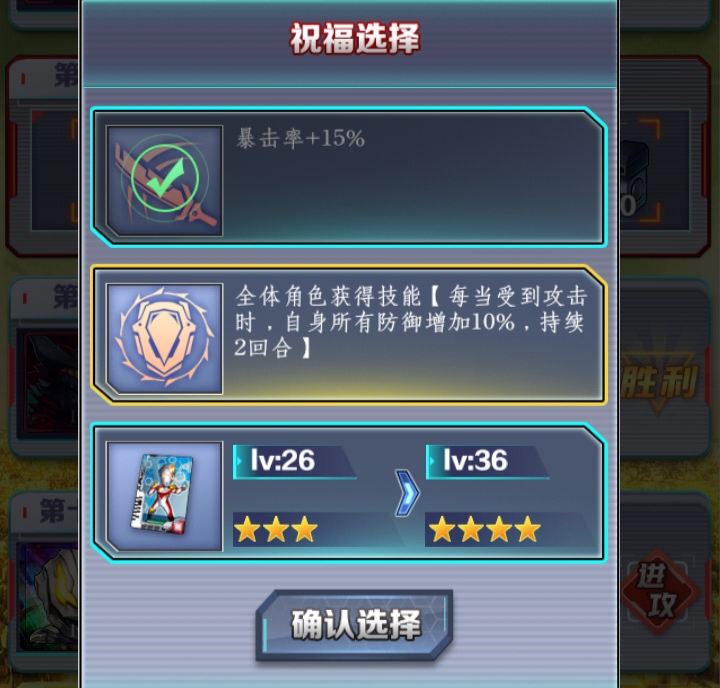 在每场战斗开始时,都可以选择一个祝福,这个的话就如下图所示,就是获得暴击率或者是回血之类的,这个如果对战力有悬殊的玩家可以斟酌一下再选