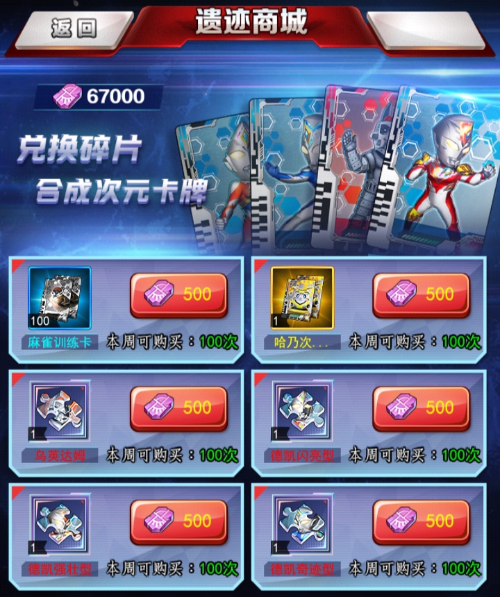 遗迹商城里面主要兑换的就是乌英达姆的卡片碎片,这个为什么要兑换后面会讲到,其次就是训练卡,或者你想玩哪个卡就兑换哪个卡的碎片