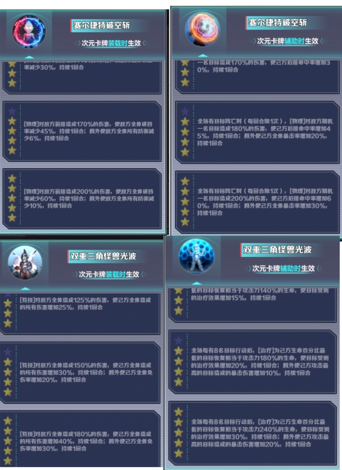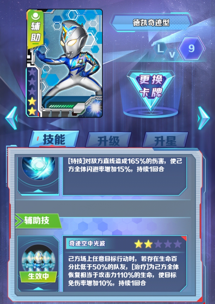 德凯奇迹型:辅助首选。他的主动技能是加闪避伤害不怎么高,而且加闪避属性也不怎么样,所以辅助技能比较好一点。任意目标行动。生命低于50%的队友可以恢复110%的血量,这个是恢复血量的一个不错的技能。还可以增加免伤率