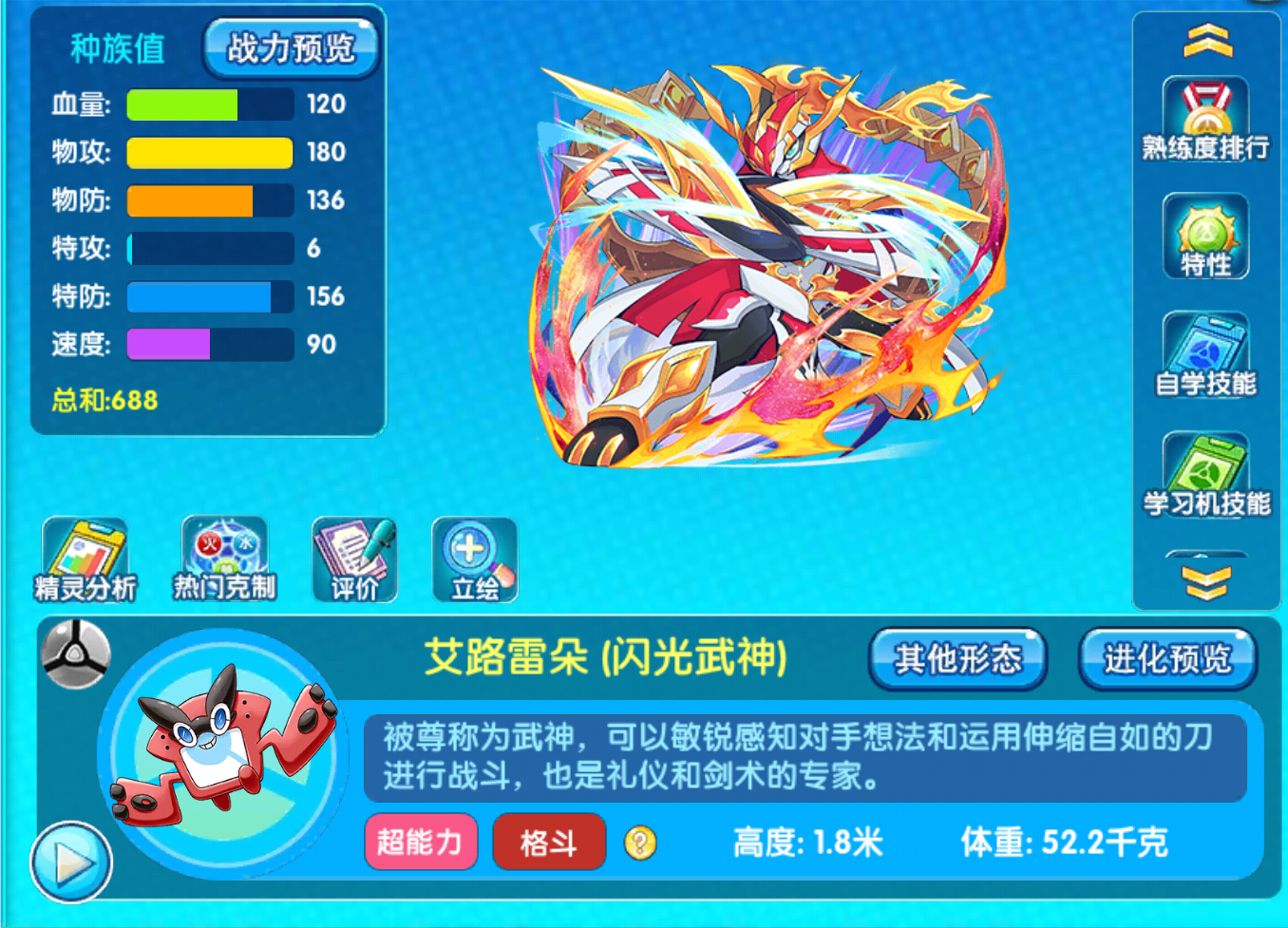 属性还是没有改变,仍然保留了原来的超能格斗属性,但超能属性在当前版本还算是不错的,最主要的还是拥有格斗属性,直接避免了超能属性恶属性的盲点,从种族值方面来看,闪光艾路雷朵对比现在的任何输出手来说,速度线可以说是非常的慢,当然了,那些低速的输出手除外因为那些宠物主要还都有高防御来进行速度上的弥补,但艾路雷朵速度不咋地,血量不咋地,防御还是不咋地具体的大家看一下满配面板图