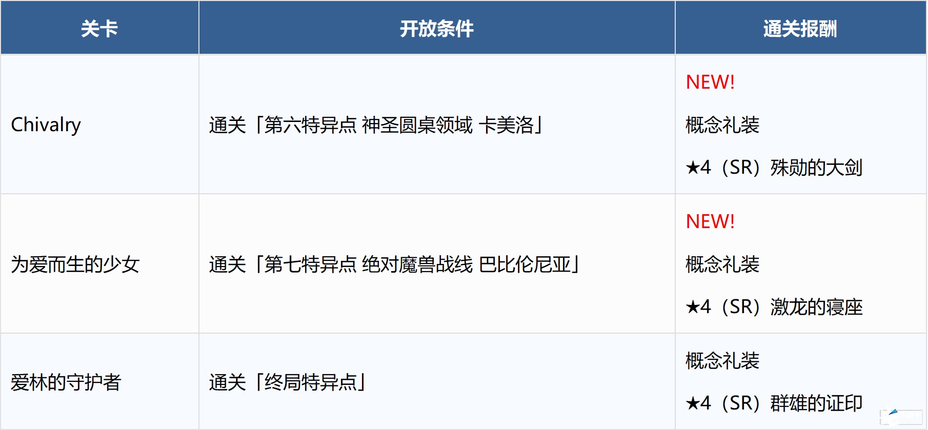 在满足既定开放条件后无论何时都能挑战进阶关卡,作为关卡通关报酬可以获得包含2张全新概念礼装的3张特别的概念礼装。