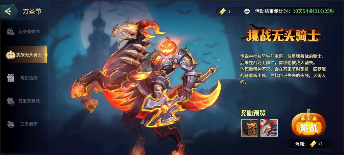 <1>.「万圣节首领战」,玩家可挑战万圣节首领「无头骑士-杜拉罕」,战胜首领,获得丰厚奖励,有概率掉落极品坐骑:梦魇战马-午夜!;