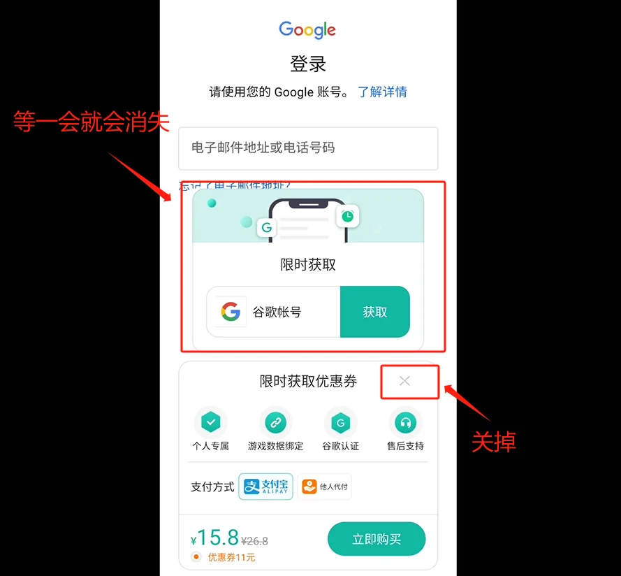 ④加载到谷歌登录界面,把下面的购买账号的弹窗X掉