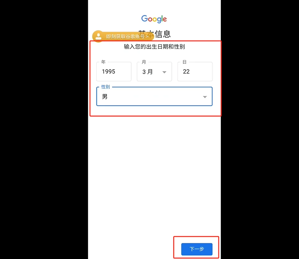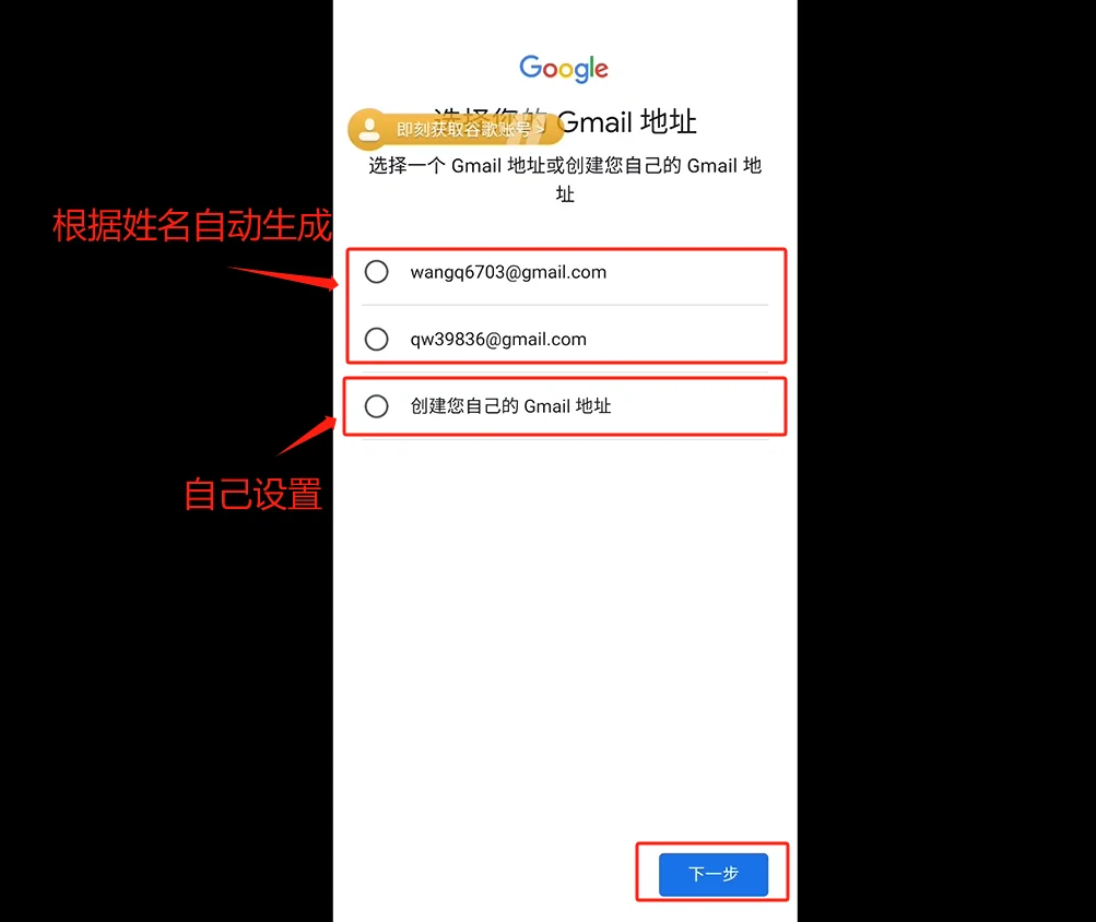 ⑧设置谷歌登录账号,前两个是根据“姓名信息”自动生成的,也可以选第三个自己设置登录账号