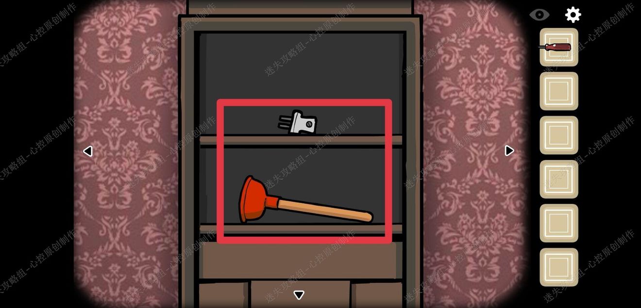🔹8、再点击洗手间下方柜子的部分,用皮搋子得到一个婴儿,打开柜子拿到一颗心脏,拿到柜子上放的红酒杯,离开洗手间,