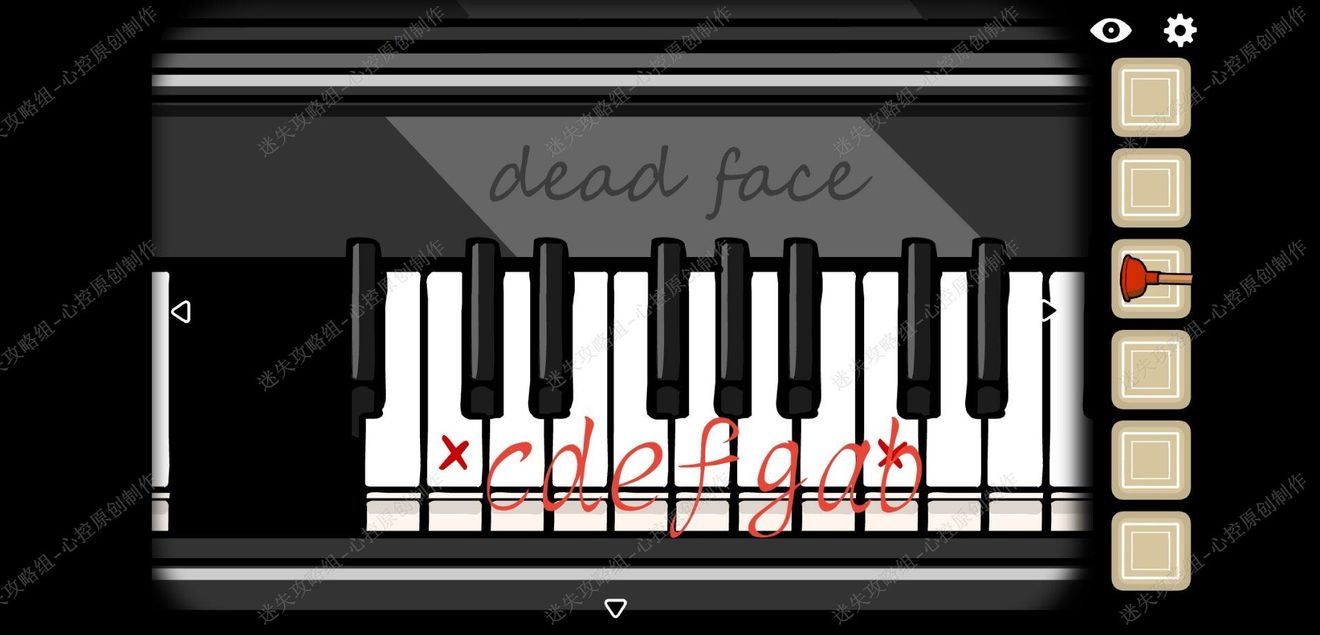 🔹6、画面向左转,点击钢琴,上面写着dead face,按照我们刚刚记下来的顺序,正确弹奏钢琴的琴键,会有一只手伸出来,我们跟着手的提示弹奏右侧红色叉范围的钢琴键,正确弹奏之后,这只手就会送出来一个钥匙,