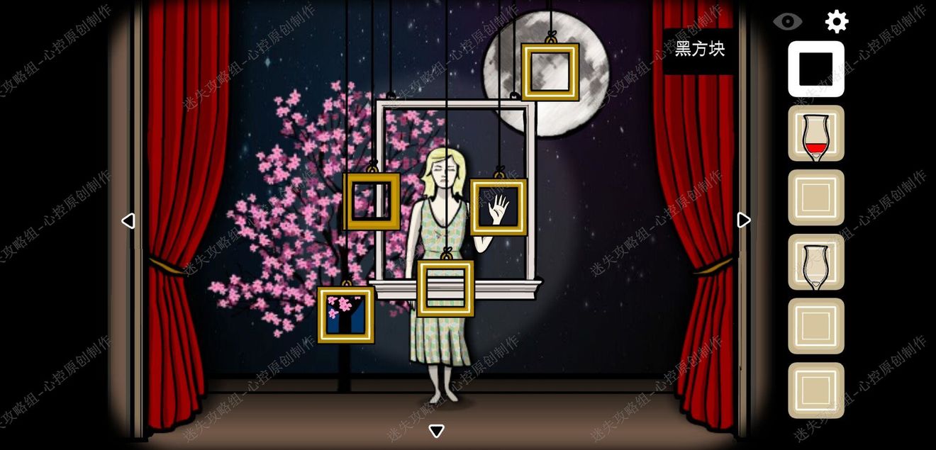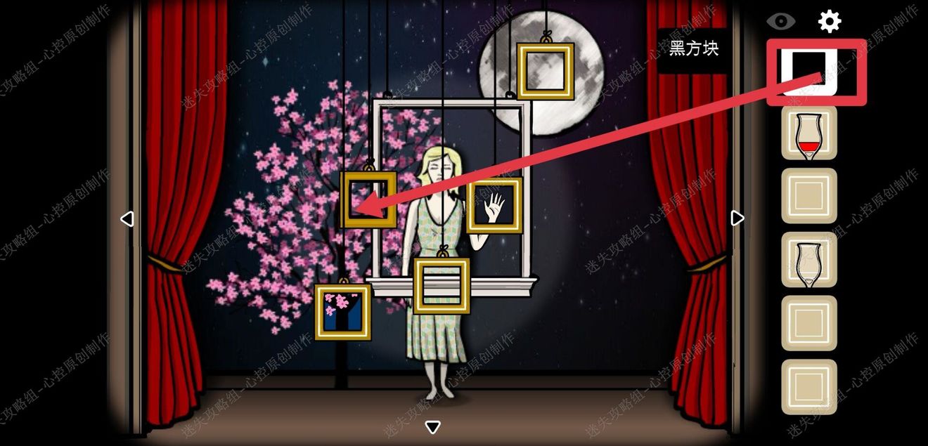 第五幕按照绿色西装男人口袋里的照片正确摆放舞台中人月亮花和相框的位置,正确摆放后会出现五个黄色的相框,先把四个白色方块放进这五个相框中,白色方块会自动变成舞台上的画面,把这四个白色方块正确的摆放到画面正确的位置上,在从左向右依次点击方块,得到爱心是5,倒三角是7,花纹是2,加号是8。